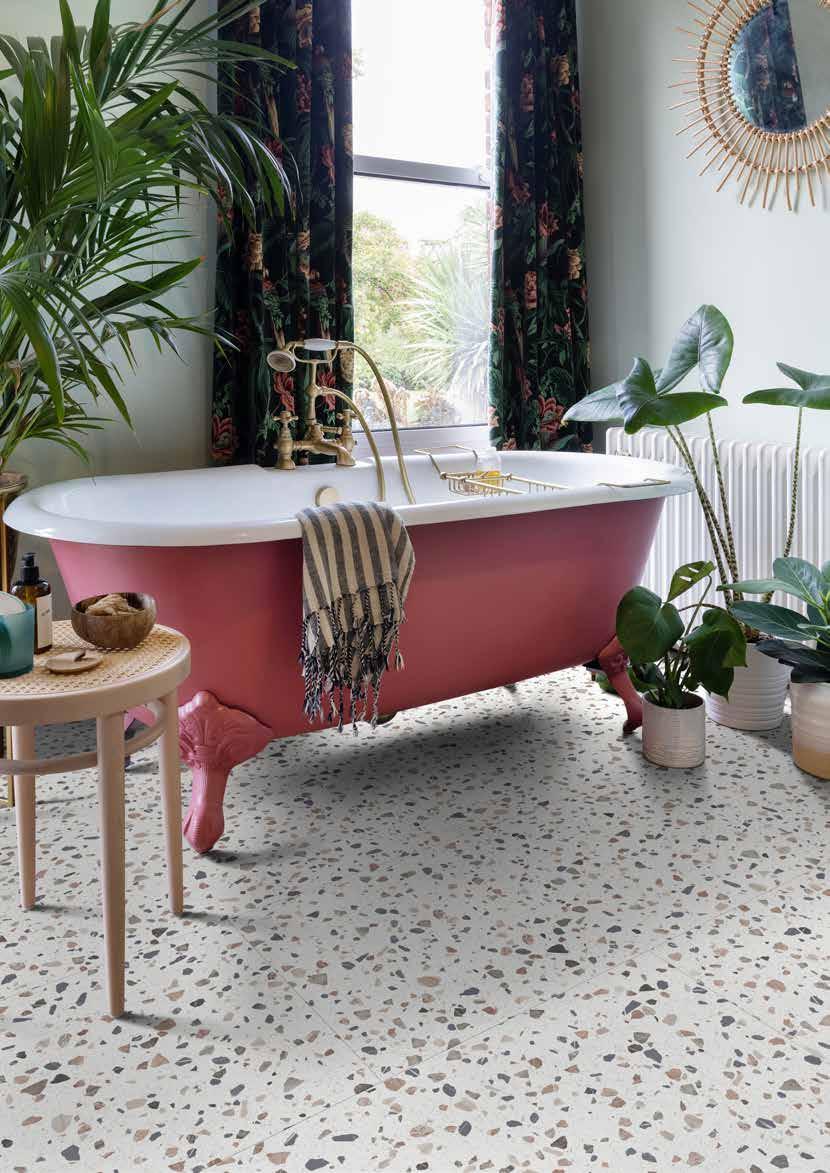 Een strakke versie van de klassieke terrazzovloer vol kleurvariaties. On trend en toch stijlvol.