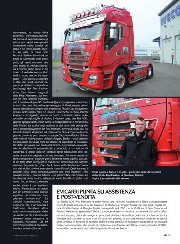 incompiuta, in attesa della prossima personalizzazione. Gli interventi riguarderanno gli interni, per i quali sono previsti rivestimenti nelle tonalità del giallo e del rosso ispirati, ancora una volta, ai colori della Ferrari. I riferimenti cromatici ai bolidi di Maranello non sono, però, gli unici elementi che sullo Stralis di Albicini ricordano il mondo delle corse e dei motori. A sottolineare quest’affinità ci sono anche tre aerografie – una sopra la calandra e altre due sugli sportelli dei gavoni portattrezzi – ispirate ai personaggi del film d’animazione Cars (Motori ruggenti) della Pixar Animation. Sul frontale del ‘Red Passion’ è ritratta, con il numero di gara 95, Saetta McQueen, la giovane e ambiziosa auto da corsa che, nel lungometraggio di Alan Lasseter, partecipa al prestigioso campionato americano Piston Cup. Sul gavone sinistro dello Stralis 500 c’è, invece, Cricchetto, il carro attrezzi loquace e arrugginito, sempre in cerca di amicizie. Infine, sullo sportello del ripostiglio di destra, è dipinto Luigi, una Fiat 500, grande appassionata delle corse automobilistiche e supertifosa della Ferrari. La scelta degli optional e dei temi delle aerografie per la personalizzazione del Red Passion’, avvenuta in più fasi, ha richiesto tempo, dedizione ed entusiasmo. “Ho sempre avuto una grande passione per i camion – spiega Giordano Albicini, titolare della Albicini Autotrasporti di Baiso (Reggio Emilia) – così, quando ha acquistato lo Stralis 500, ho deciso di arricchirlo al massimo. L’ho fatto per gradi, con l’aiuto del titolare di un’azienda specializzata in allestimenti personalizzati, conosciuto a un raduno di camionisti. Il primo passo è consistito nella sostituzione del condotto di scarico originale con uno cromato. Poi sono venute le altre cromature e i supporti per la fanaleria sopra cabina. La scelta dei temi delle aerografie è caduta sui personaggi del cartone animato che preferisco, Cars. Per il colore dello Stralis non ci sono mai stati dubbi: poteva solo essere rosso Ferrari”. Quali saranno i prossimi passi nella personalizzazione del ‘Red Passion’? “Nei Nella pagina a fianco e in alto, i particolari delle decorazioni prossimi mesi – precisa Albicini – mi piacerebbe intervenire sui dello Stralis Red Passion di Giordano Albicini. rivestimenti della cabina, utilizzando varie tonalità di giallo o di Sopra, il proprietario del veicolo rosso. Poi, in futuro, potrebbe anche esserci un impianto stereo. Partecipare ai raduni con un camion come questo significa, sicuramente, non passare inosservati”. La Albicini Autotrasporti, nata Lo Stralis 500 ‘Red Passion’ è stato fornito alla Albicini Autotrasporti dalla concessionaria negli anni ’60, è un’azienda a Iveco Evicarri, che opera nelle province di Modena e Reggio Emilia con due sedi: quella stotradizione familiare attiva rica di Villa Bagno di Reggio Emilia, inaugurata nel 2001, e la struttura di San Cesario sul nella movimentazione delle Panaro (Modena), aperta nel 2009. La concessionaria coordina un network di undici officipiastrelle per le industrie del ne autorizzate, dislocate lungo le principali direttrici di traffico dell’area di riferimento. La distretto della ceramica di Evicarri può contare su uno staff di circa 40 addetti, di cui una ventina dedicati ai servizi Sassuolo (Modena). Da tre post-vendita. E proprio in questo settore sono riposte le maggiori prospettive di crescita generazioni utilizza esclusivadella concessionaria, che conta di migliorare quest’anno del 20 per cento, rispetto al 2013, mente camion di Iveco. le vendite dei ricambi per tutte le gamme di veicoli Iveco.