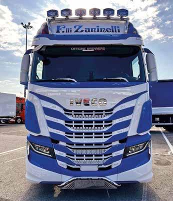 Lo spirito sportivo delle gare si è riflettuto sulla spettacolare livrea bianca e blu con l’iconico scorpione dell’IVECO S-Way AS440S53T/P di Zaninelli Trasporti, cliente curato da Officine Brennero; il veicolo è arricchito da bull bar su tetto, decorato con la bandiera italiana. Il veicolo è dotato di 530 cv ed è alimentato da motore Cursor 13