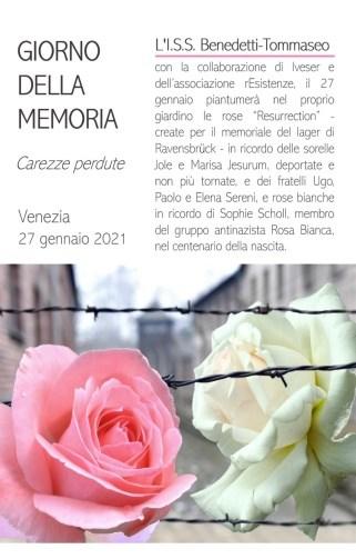 pubblico, ma solo una cerimonia in Campo del Ghetto a cui sono seguite le pose accompagnate da una ristretta delegazione. Numerosi sono stati gli eventi organizzati lungo tutto il mese di gennaio, tra i quali si ricordano la presentazione della tesi di laurea di Emilia Peatini su Olga Blumenthal: Olga Blumenthal. Storia di una vita, con la partecipazione dell’autrice, di Simon Levis Sullam, Giulia Simone e Luisa Bellina, in collaborazione con l’Università Ca’ Foscari, CFZ, il Consiglio d’Europa sede di Venezia, rEsistenze e Beit Venezia. Il 25 gennaio 2021, nell’Aula magna virtuale dell’Ateneo Veneto, la conferenza di Ilaria Pavan, della Scuola Normale Superiore di Pisa, intitolata Riparare, restituire, ricordare. Le dinamiche economiche e sociali della persecuzione razziale fascista e le sue conseguenze di lungo periodo (evento in collaborazione con Anppia Venezia), l’iniziativa Gli anni rubati. Le memorie di Settimia Spizzichino reduce dai Lager di Auschwitz e Bergen Belsen con letture di studenti e studentesse dell’Ateneo e dell’Istituto Navale Francesco Morosini, musiche di Michele Gazich e in collaborazione con l’Università di Ca’ Foscari, Radio Ca’ Foscari, il CE.DO.DI; la piantumazione delle rose “Resurrection” e delle rose bianche nel giardino dell’I.S.S. BenedettiTommaseo (27 gennaio 2021), oltre all’itinerario guidato virtuale sulla deportazione intorno alle Pietre d’Inciampo condotto da Stefania Bertelli il 30 gennaio 2021.