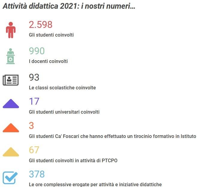 Nel corso dell’anno l’attività realizzata si è così diversificata: 40 laboratori didattici; 17 lezioni frontali; 30 itinerari della memoria; 3 attività varie. Malgrado le difficoltà della pandemia, abbiamo così ricominciato a fare attività anche in presenza e se le lezioni frontali sono leggermente diminuite rispetto al 2020, sono significativamente aumentati sia i laboratori didattici che gli itinerari della memoria. Importante anche la crescita della formazione e l’aggiornamento degli insegnanti. Nel 2021 si sono tenuti 14 incontri incentrati soprattutto sulla didattica della Storia, sull’insegnamento digitale, sull’educazione civica, in collaborazione con gli Isr del Veneto. Complessivamente nel 2021 sono stati coinvolti 93 classi, 2.598 studenti, 990 docenti, per complessive 378 ore erogate.