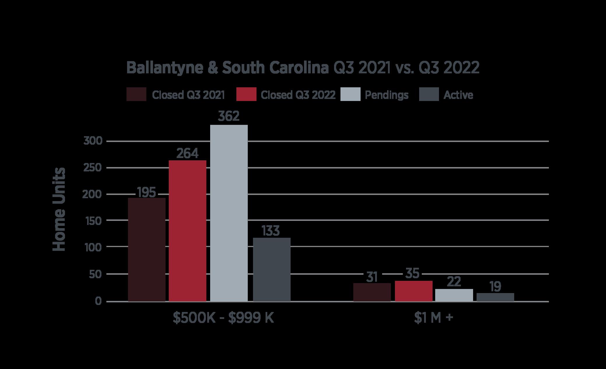 Standout areas and price segments included the continued emergence of upstate South Carolina on the Lake Wylie and Ballantyne sides of I-77, activity in the Fort Mill area surpassing last year ’ s third quarter in the luxury segment. The Providence Road corridor into Union County continued to attract high levels of luxury activity, with over 100 properties over $1 million in value closing for the quarter. Niche segments that stood out included the 277 beltway area ’ s condo and townhouse market with 120 closings vs last year ’ s 72, and Myers Park and Eastover’s high-end luxury segment above $2 million, which recorded 8 closings and 10 pending contracts, leaving just 9 active homes in the MLS.