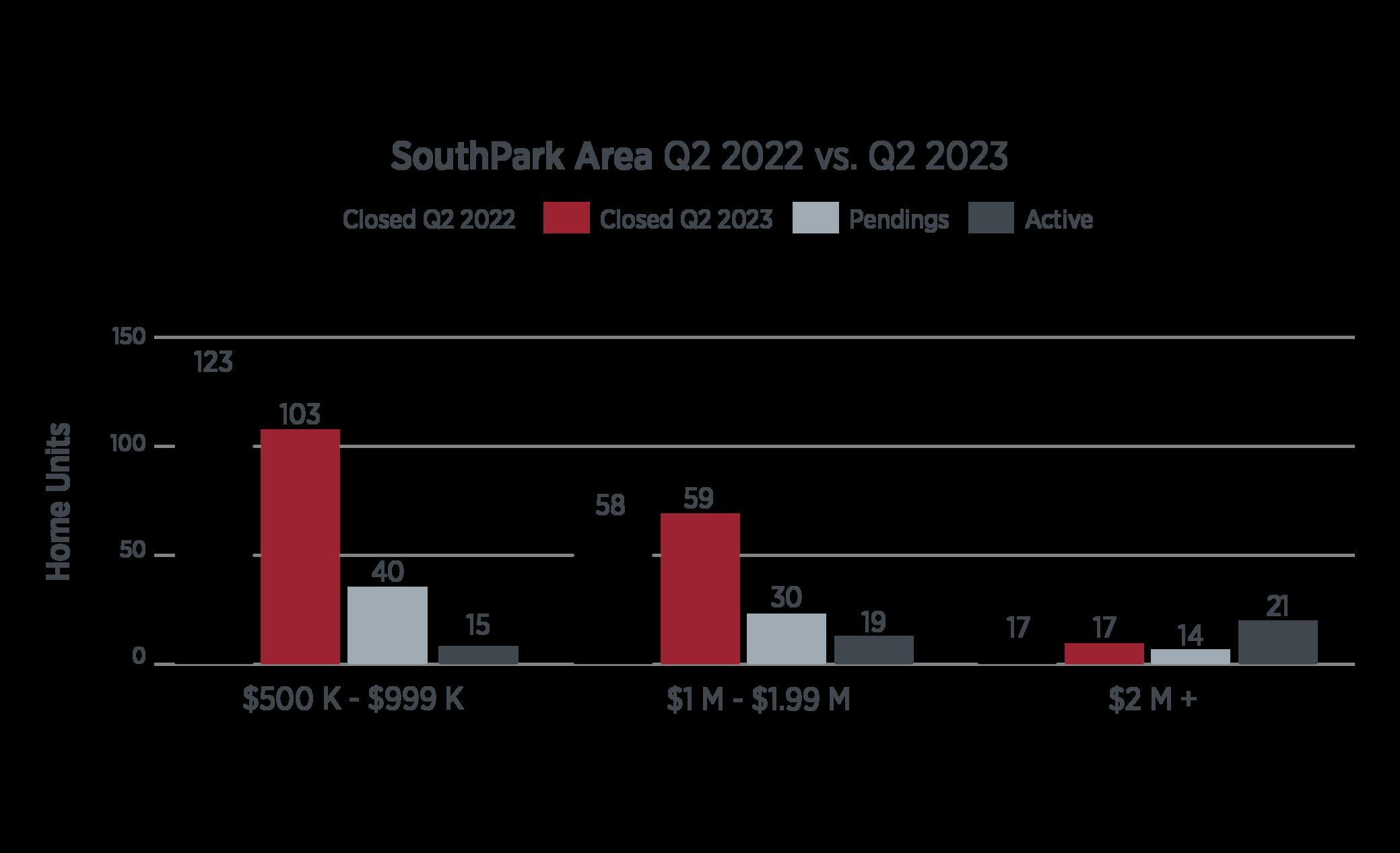 The always in high-demand SouthPark area saw slight declines in the mid-market range below $1 million. However, it once again saw a record quarter with 59 homes closing between $1 million and $2 million with another 17 closing above $2 million, both segments coming in equal to or exceeding last year ’ s second quarter results. The quarter ended with 14 homes under contract over $2 million on an inventory of 21 homes, roughly 60 days worth of supply