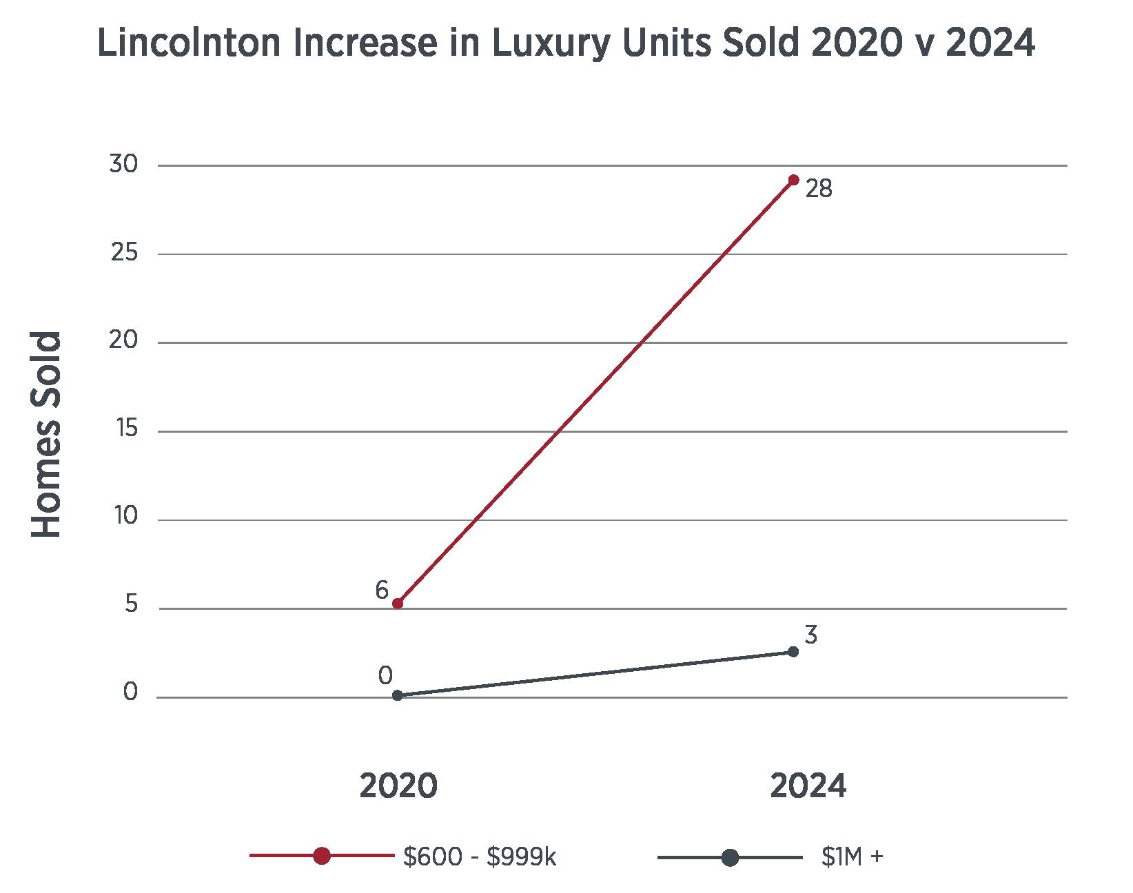 Like their neighboring Lancaster County locations, the South Carolina communities of Clover and York both saw a spike in mid-market luxury activity, with closings rising from 28 in 2020 to a sizzling 143 units closed in 2024. The luxury range similarly spiked from 14 closings in 2020 to 37 in 2024, as Lake Wylie gained in popularity, and luxury new construction in the million-plus range attracted some buyers. Handsmill on Lake Wylie attracted interest, and the lake saw a recordsetting $3.3 million deal close in 2024.