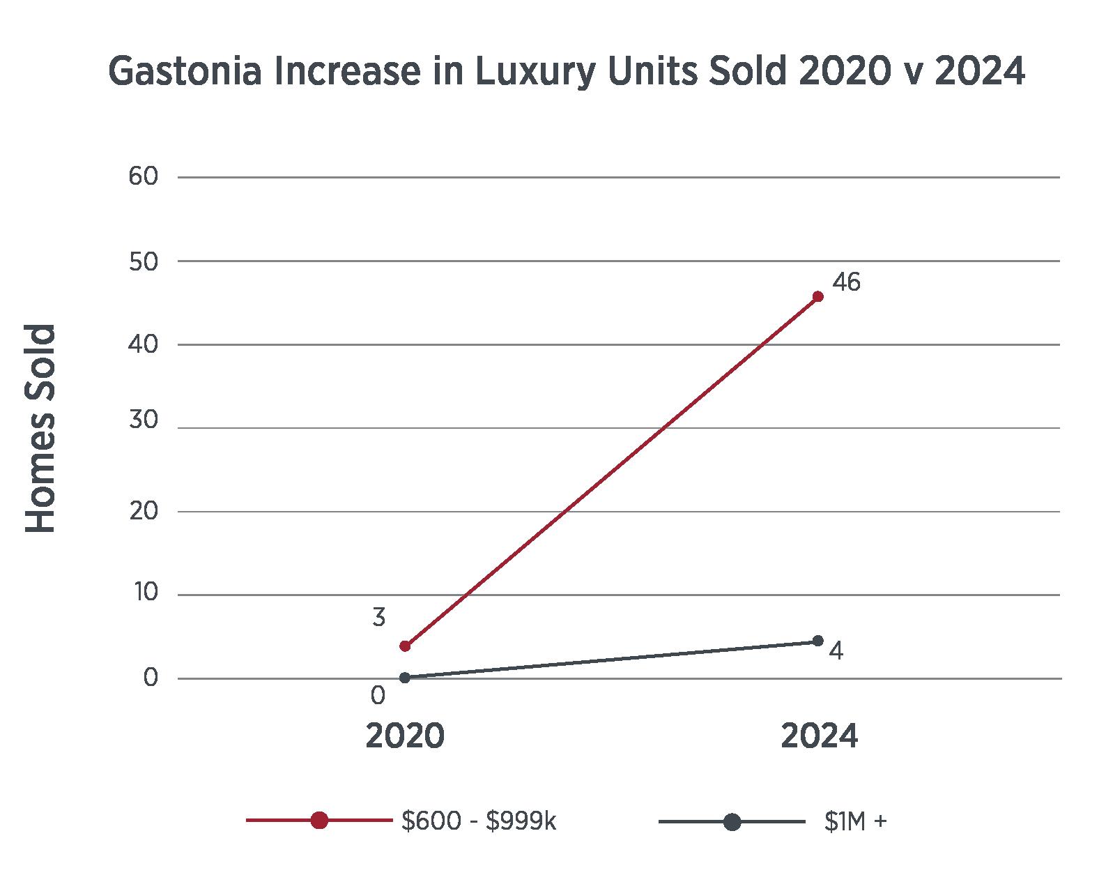 Neighboring Belmont spillover has started to impact Gastonia, where, like Monroe, the upper segment just below the million-dollar threshold rocketed from 3 closings in 2020 to 46 in 2024, as communities like Robinson Oaks attracted activity. While the range above $1 million is not quite there yet, it’s beginning to percolate, with 4 closings in 2024 vs 0 in 2020.
