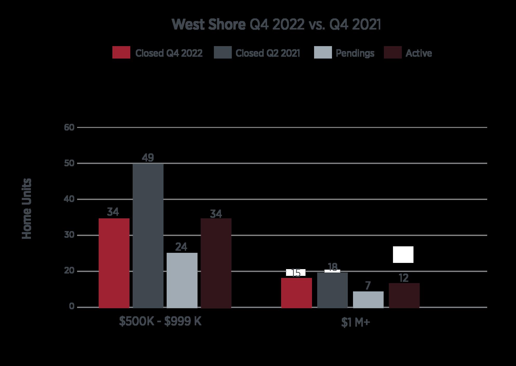 The west shore area displayed similar characteristics to Davidson, with the market under $1 million in list price showing more tapering (34 closings in Q4 vs. 49 the prior year). Inventory in this segment remained manageable, with 34 active homes supported by 24 pending contracts.