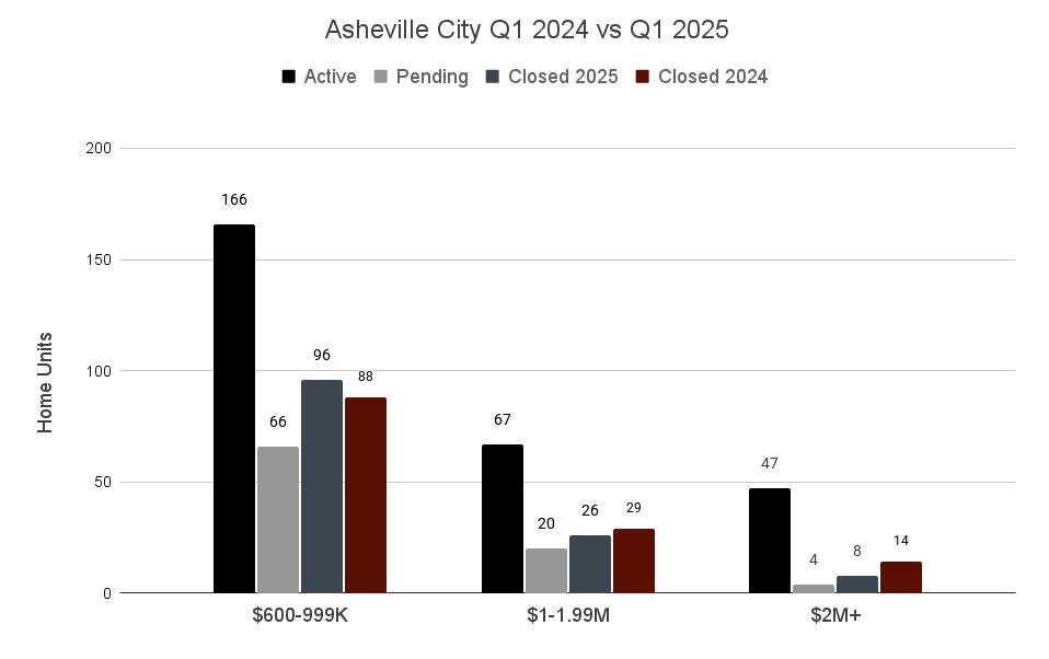 The Asheville market demonstrated overall steadiness this quarter, with encouraging signs pointing toward a more active second quarter In the mid-market range $600K–$999K, closed sales came in at 96, a sizable jump from 88 during the first quarter of 2024, while active inventory has climbed to 166 listings, giving buyers a wider selection The luxury market $1M–$1 99M held mostly flat with 26 closed transactions this year versus 29 a year ago However, 20 homes are currently under contract, indicating solid buyer engagement and potential for a strong second quarter The ultraluxury segment $2M+ was softer, with only 8 sales in this quarter, down from 14 last year Still, inventory continues to rise, and with more listings entering the market, we may see a resurgence in the months ahead