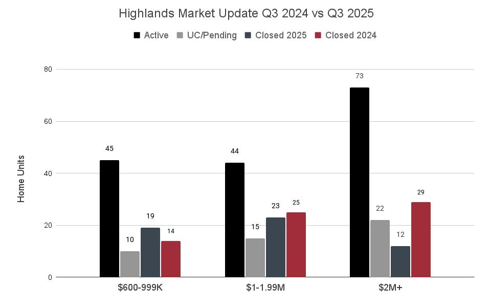 Highlands saw a meaningful uptick in mid-market activity, with 19 sales in the $600K – $999K range this quarter, up from 14 in the third quarter of 2024. However, luxury and ultra-luxury performance softened. The $1M – $1.99M segment posted 23 closings, down slightly from 25 a year ago in the same period, while the ultra-luxury tier saw a sharper drop with just 12 sales compared to 29 in the third quarter of 2024