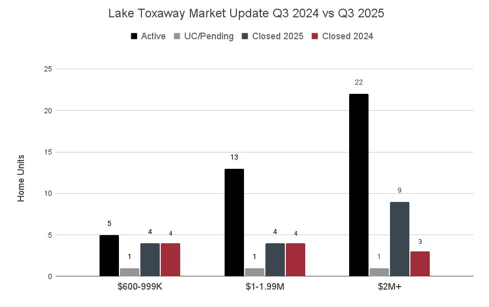 With 22 active listings over $2M and only one currently under contract, absorption at the top remains slow, but the recent increase in closings suggests renewed confidence in this historically exclusive market. Lake Toxaway continues to appeal to luxury buyers seeking privacy, natural beauty, and elevated amenities