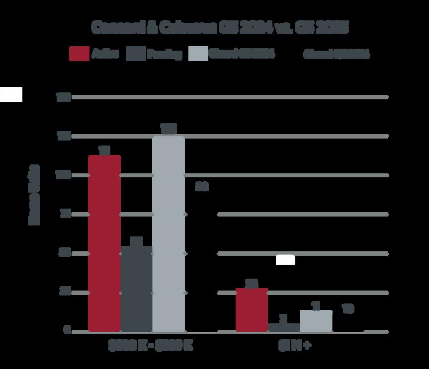 Cabarrus County continues to post high levels of activity in the mid-market luxury ranges from $600,000 to $2 million in list price. The region saw a whopping 125 transactions just below $1 million in price, vs 88 in last year ' s third quarter. Above $1 million, the area continues to emerge with more activity, with 11 homes closing vs 10 last year, while inventory has increased to meet the growing demand in Concord, Kannapolis, and the southeast corridor of the county east of Charlotte.