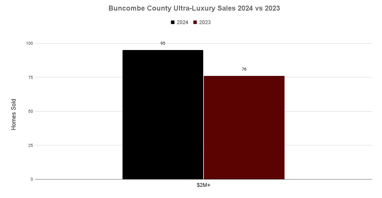 The Ultra-Luxury Segment has seen significant growth in 2024 in spite of the challenging circumstances Western North Carolina has faced in the last three months. Buncombe county saw 95 homes sold in the Ultra-Luxury Market 2M+ in 2024, up 25% from 77 homes sold in 2023.