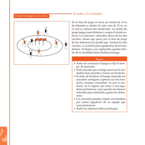 po de duración. • Todo atacante que consiga atravesar la ciudadela tiene derecho a tomar un banderín. • Si antes de finalizar el tiempo marcado los atacantes consiguen capturar las tres banderas, resultan vencedores. Si, por el contrario, no lo logran, por tener a sus jugadores prisioneros, o por quedar un número reducido para intentarlo, ganan los defensores. • Los atacantes pueden canjear una bandera por cuatro jugadores de su equipo que sean prisioneros. • Todos los alumnos deben participar.