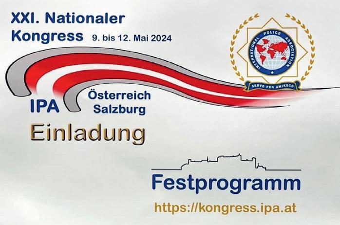 IPA INTERN Nachruf Kapitän Otto Steindl 3 Help Ukrainian Children 5 Einladung zum Festabend XXI. Nationaler Kongress 9 Buchpräsentation 10 IPAkademie Die Polizei und der Tod 8 Seminarübersicht 2024 8 FACHARTIKEL Klimakleber contra Polizei 6 YPOS – Younf Police Officers Seminar Austria 2024 11 REISEBERICHTE New York 9 SONSTIGES Polizei-Nostalgie 10 Kalender 12 IPA-Rätsel 31 Impressum 31 BUNDESLÄNDER Burgenland 13 Kärnten 15 Niederösterreich 17 Oberösterreich 19 Salzburg 21 Steiermark 23 Tirol 25 Vorarlberg 27 Wien 29
