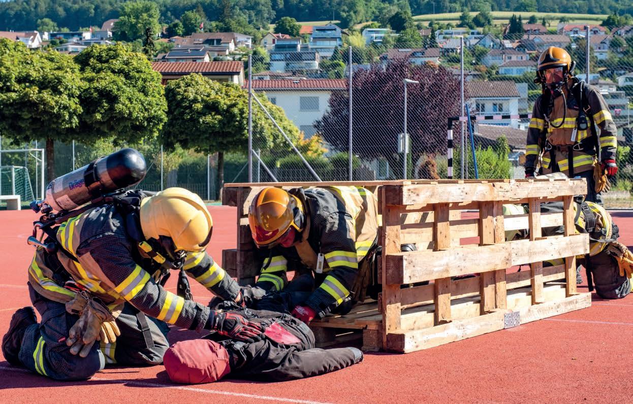 Il posto 4, che consisteva in un «Corso di abilità / resistenza», è stato quello fisicamente più stancante di tutta la gara, in particolare per le squadre che lo hanno svolto di pomeriggio sotto una temperatura di 30 °C. Sulla caldissima superficie in gomma del campo sportivo della scuola, i tre portatori di autorespiratori* di ciascuna squadra hanno dovuto prima spingere il comando operativo seduto su una carriola attraverso tralicci e ostacoli, con circa 25 chilogrammi di attrezzatura sulle spalle. Hanno poi dovuto pescare dei pesci con canne minuscole da un piatto rotante, avendo a disposizione solo il tempo in cui il capo dell’operazione riusciva a tenere una benna di sabbia di 6 chilogrammi. Sdraiato a pancia in giù e con le braccia tese ... Dopo una breve pausa di respiro, bisognava portare un dummy non proprio maneggevole per i pallet e «salvarlo» prima di trasportare uno pneumatico di trattore ad altezza d’uomo attraverso la piazza, ribaltandolo ripetutamente. Chi, dopo di ciò, aveva ancora fiato, doveva scagliare due lance contro un bersaglio segnato e poi concludere il percorso trasportandovari sacchi di sabbia su una tratta di circa sei metri.