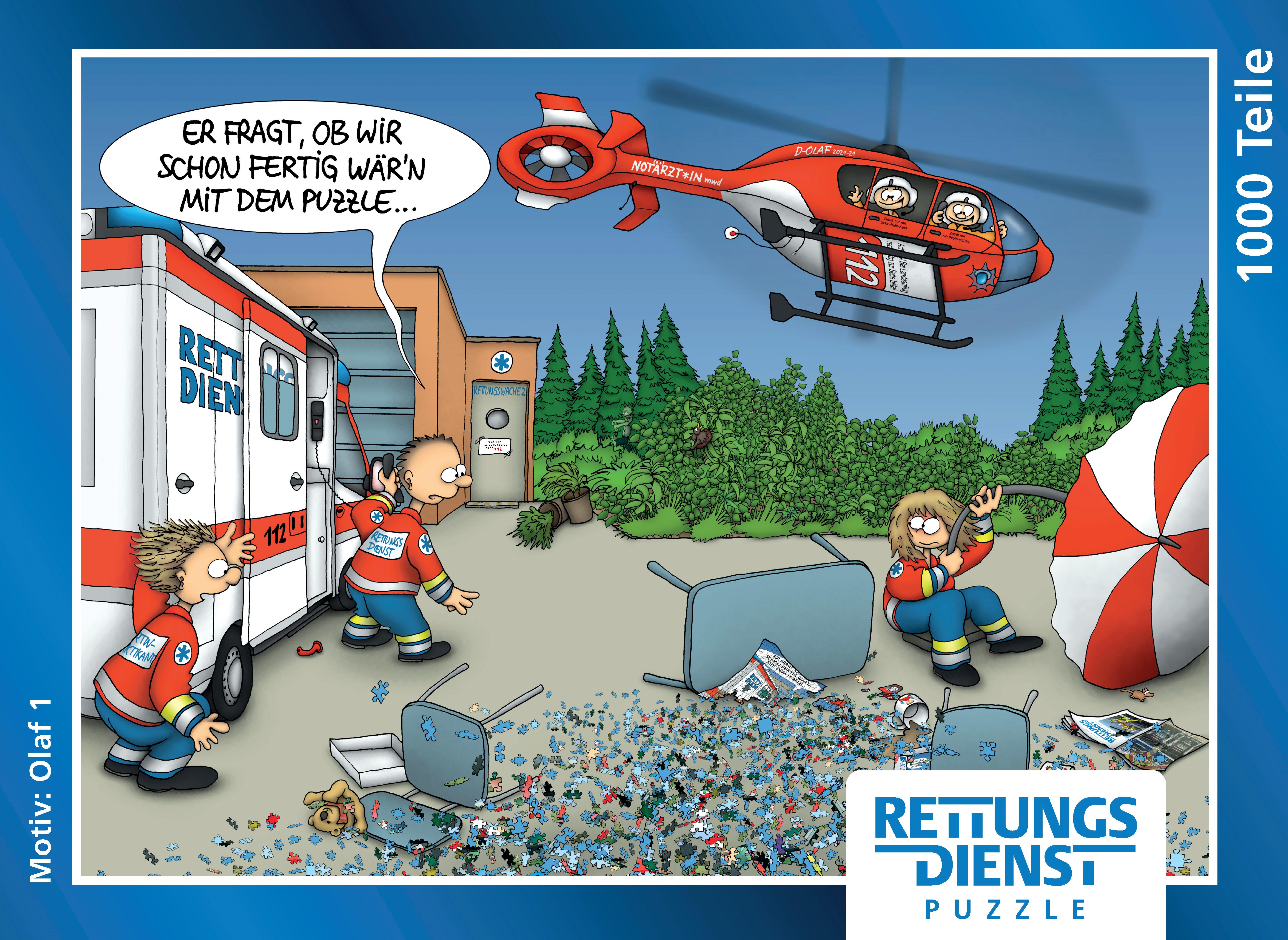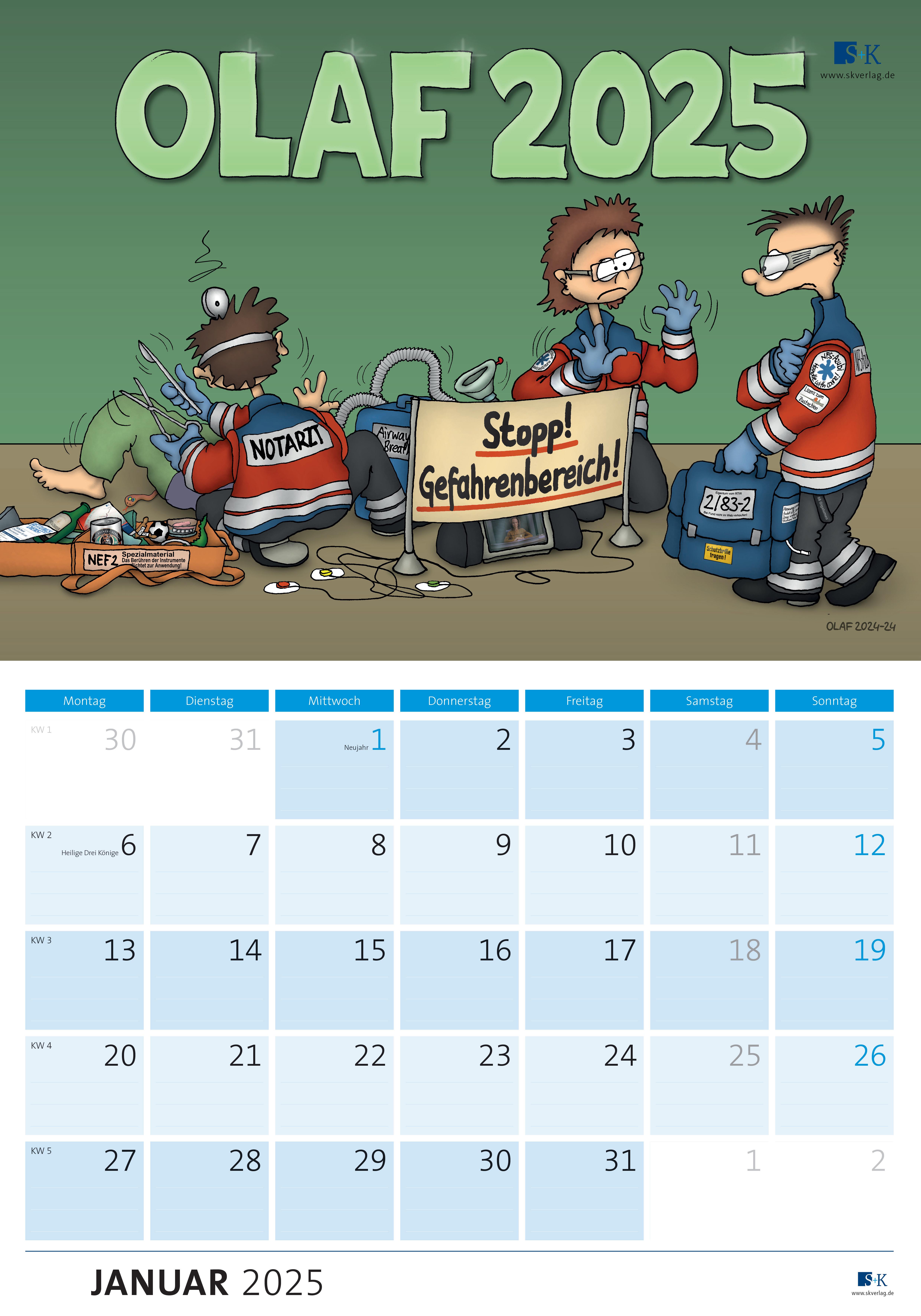 Il calendario da parete di OLAF ironizza con tono amorevole sulle situazioni quotidiane del soccorso e sulle peculiarità delle forze di intervento. I 12 fumetti sono un catturasguardi nelle guardie mediche e portano il buon umore nei giorni più stressanti. Il tema del calendario del 2026 non è stato ancora svelato.