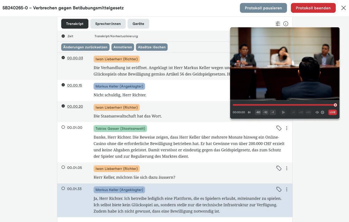 Die Protokollierung von polizeilichen und gerichtlichen Einvernahmen und Verhandlungen nimmt heute viel Zeit in Anspruch. Die KIbasierte Lösung Hastings automatisiert die Protokollierung weitgehend, indem die Konversation in Echtzeit transkribiert und wenn nötig übersetzt wird. Noch während des Gesprächs oder der Verhandlung kann das Protokoll editiert und annotiert werden. Die Zeit für Protokollbearbeitung wird damit auf ein Minimum reduziert.