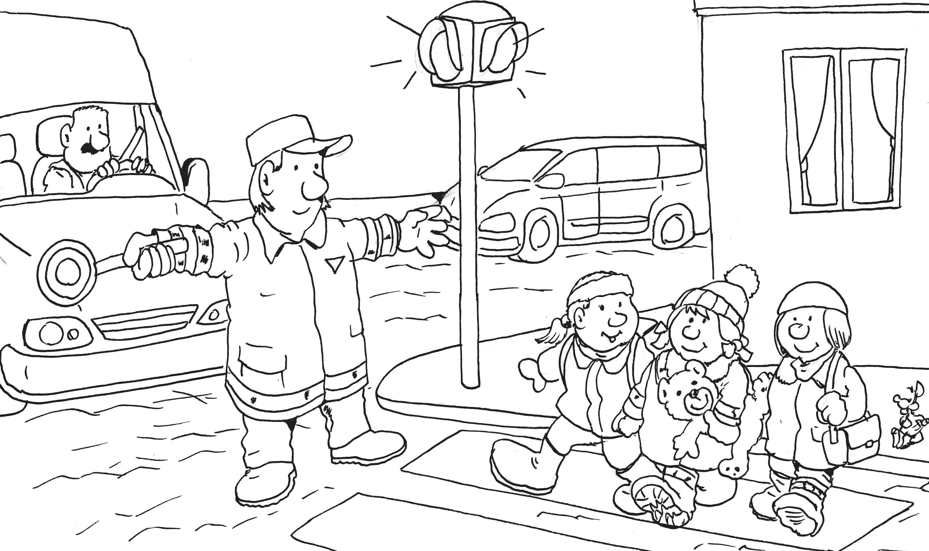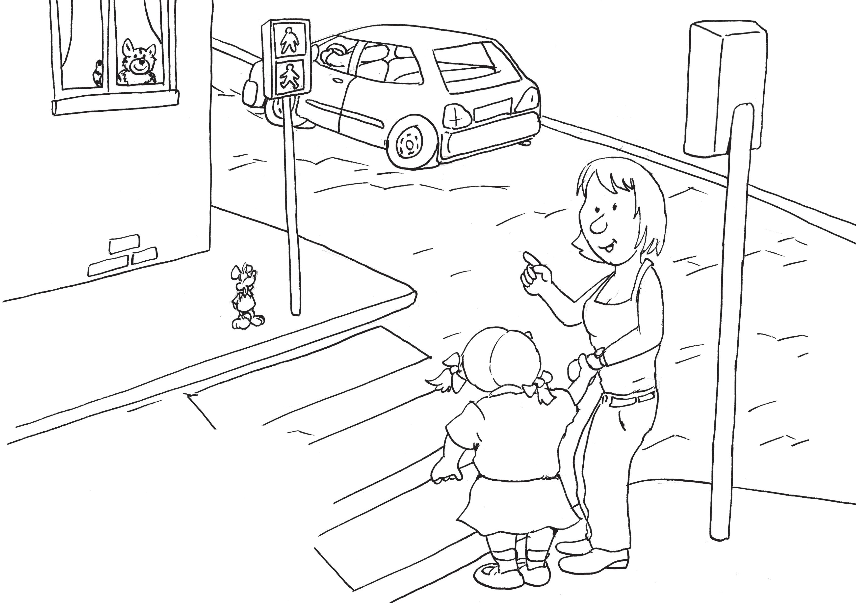 Gemeinsam mit einigen Freundinnen ist Theresa in der Zwischenzeit fast beim Kindergarten angekommen. Als letztes „Hindernis“ wartet noch eine Straße, die sie überqueren müssen. Zum Glück aber befindet sich dort ein Zebrastreifen. Ein Verkehrslotse hilft ihnen beim Überqueren der Straße, indem er mit seiner deutlich sichtbaren Kelle alle Fahrzeuge anhält.