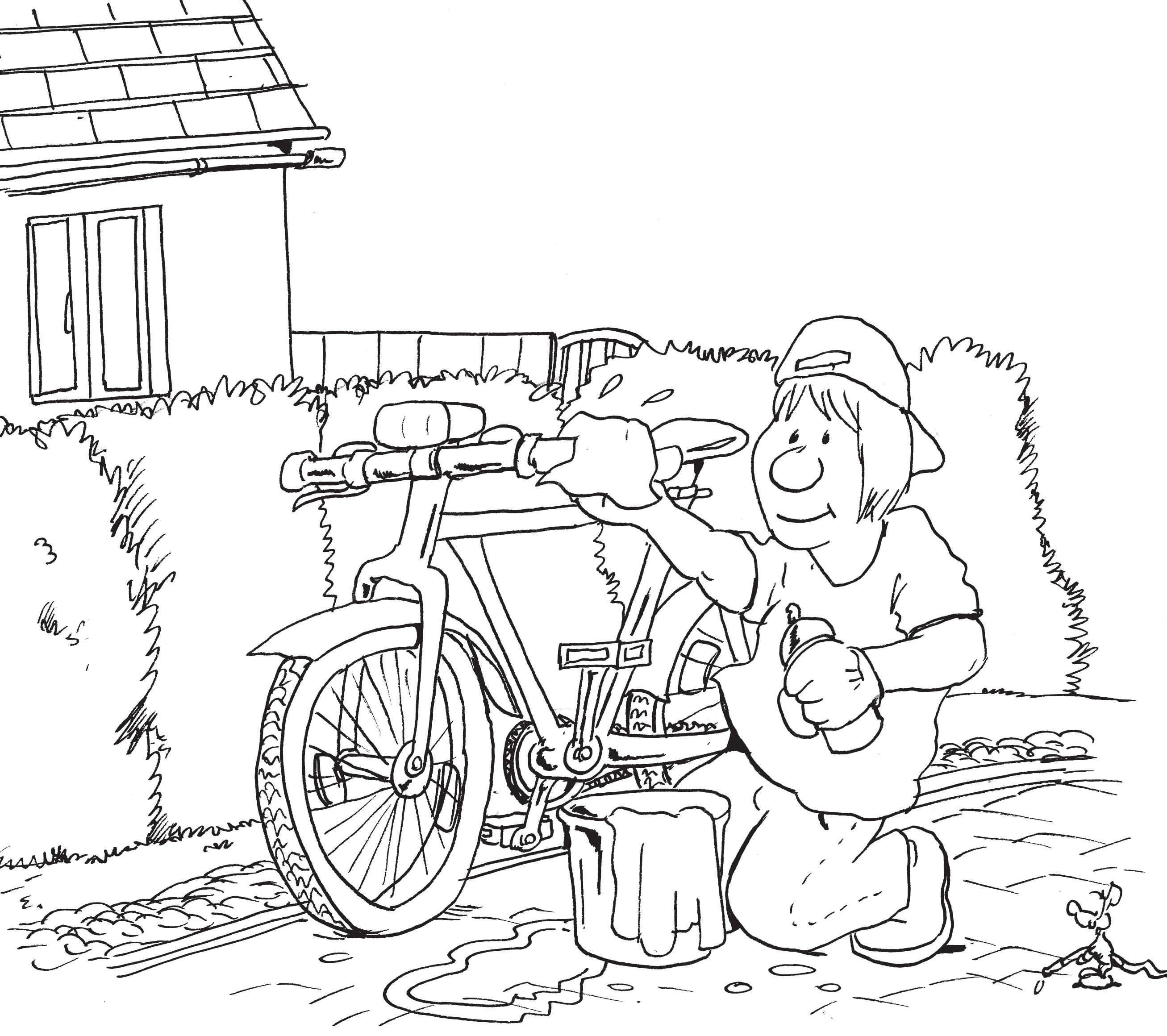 Thomas achtet gut auf sein Fahrrad und reinigt es regelmäßig, wenn das Wetter schön ist. Besonders schaut er darauf, dass er alle Lichter und Reflektoren von Schmutz und Staub befreit. Er überprüft auch immer, ob nichts defekt ist – vor allem natürlich die Bremsen. Er ist erst zufrieden, als die Rückstrahler an den Speichen der Reifen und an den Pedalen vor Sauberkeit glänzen.
