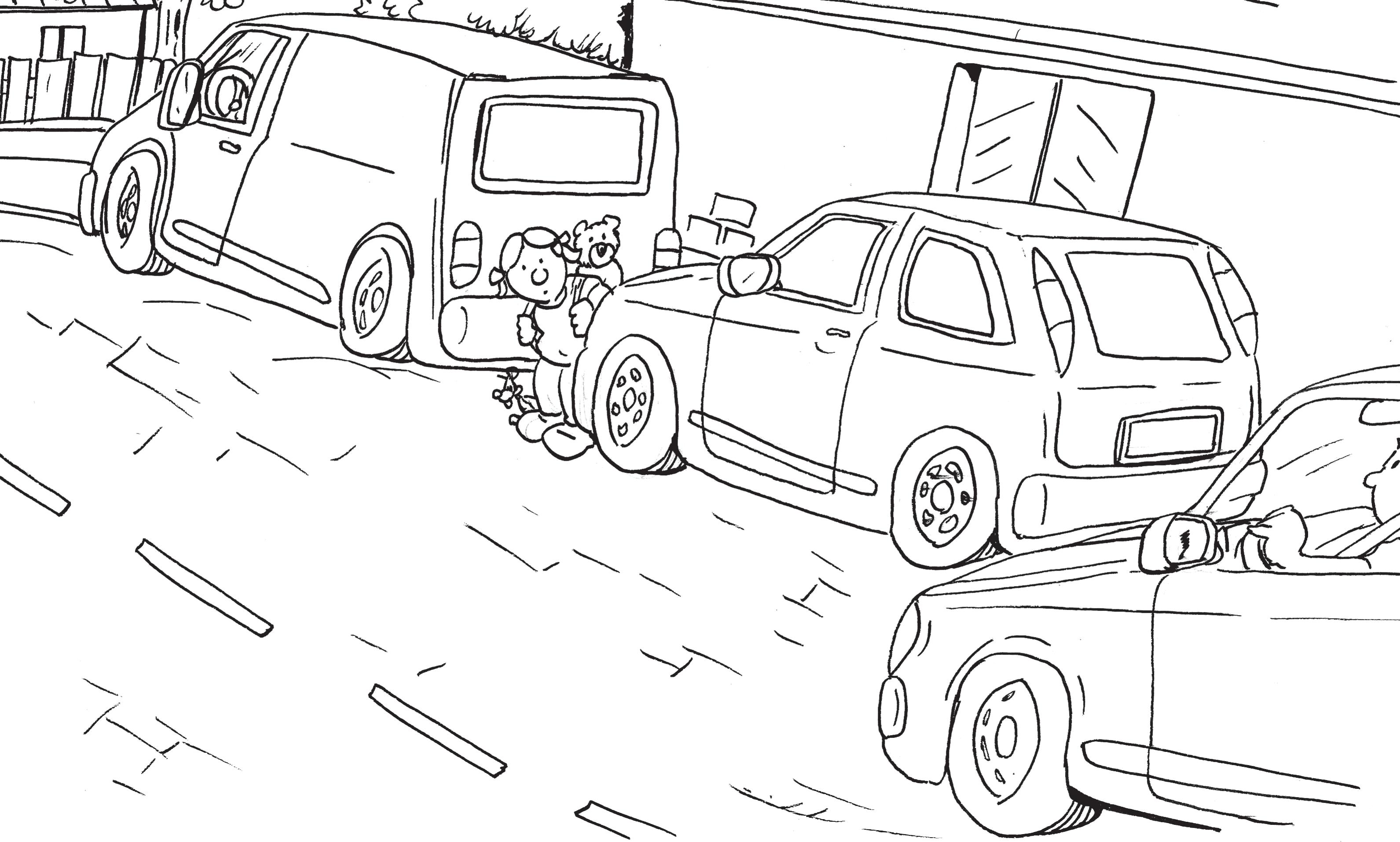 Auf dem Weg zur Schule achtet Theresa immer genau darauf, von anderen Verkehrsteilnehmern gut gesehen zu werden. Besonders passt sie auf, wenn sie zwischen am Straßenrand parkenden Autos steht und die Straße betreten will. Sie weiß genau: Das ist gefährlich! Denn sie ist klein und wird daher leicht übersehen.