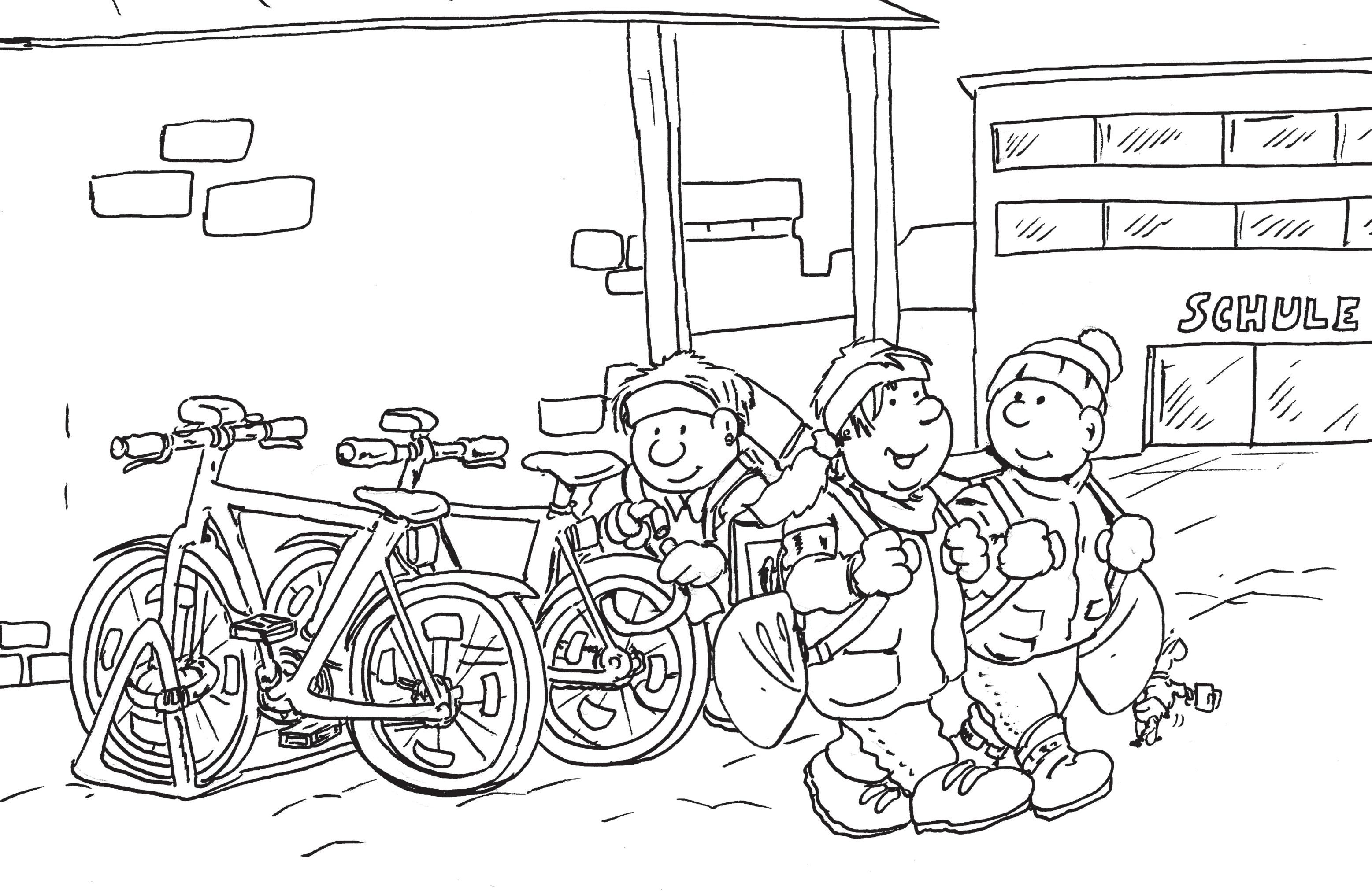 Sobald Natalie in der Grundschule angekommen ist, stellt sie ihr kostbares Fahrrad am dafür vorgesehenen Fahrradabstellplatz ab und versperrt es mit einem eigenen Schloss. Ihren Fahrradhelm nimmt sie einfach mit.