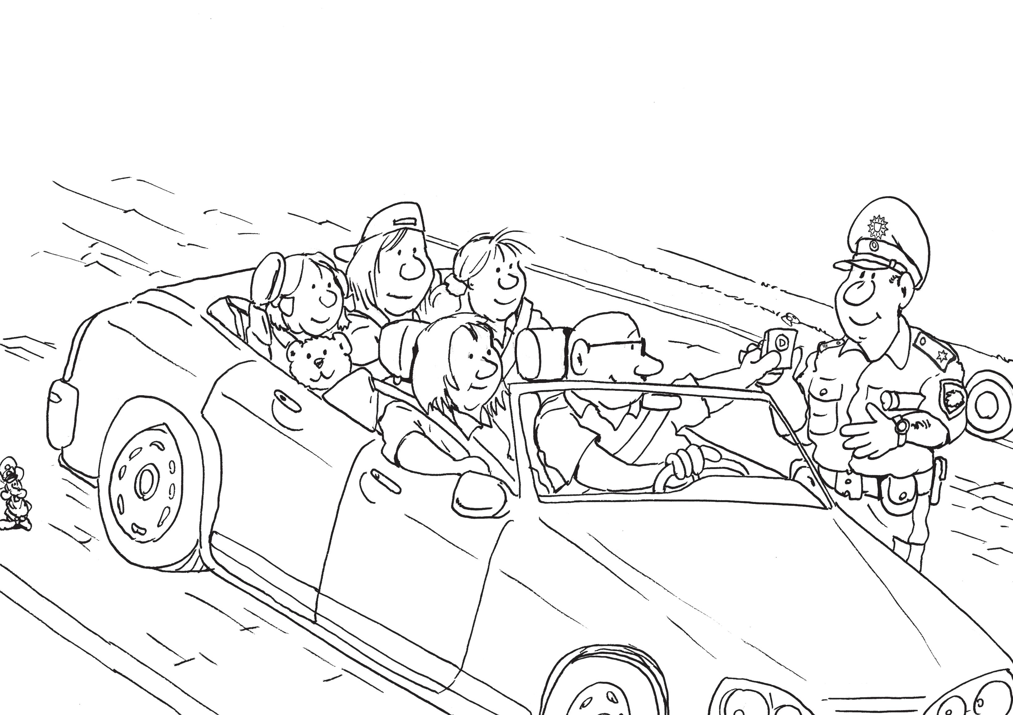 Als sie eine Weile gefahren sind, werden sie an einer Kreuzung von einem netten Polizisten angehalten. Er kontrolliert Führerschein und Zulassung von Vater Peter. Es ist alles in Ordnung – der Polizist winkt und wünscht der Familie eine gute Fahrt.