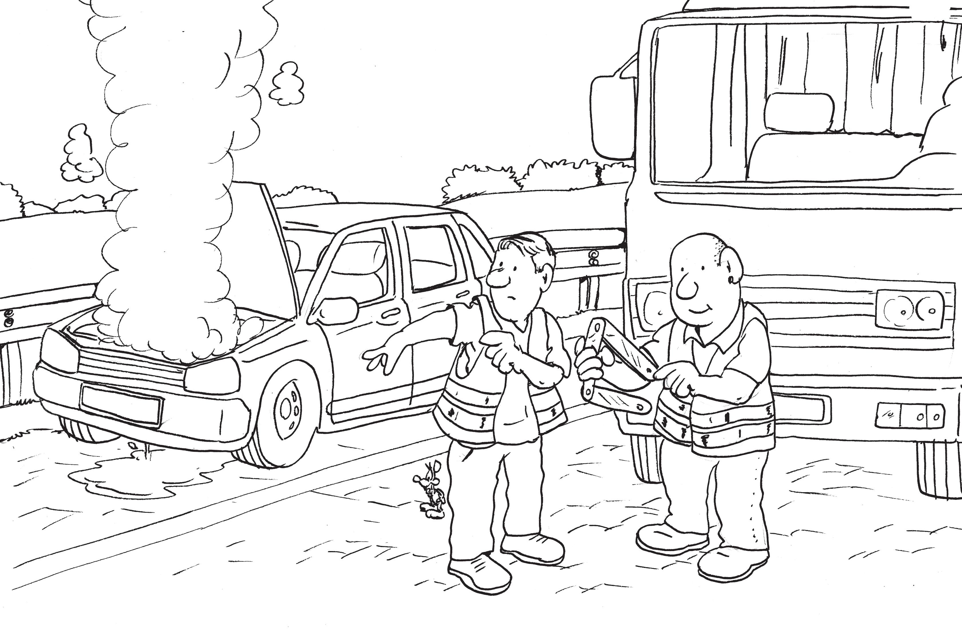 Ein Autofahrer hat sein Fahrzeug am Straßenrand geparkt. Aus der Motorhaube steigt Rauch auf. Er hat eine Panne und kann nicht mehr weiterfahren. Brummifahrer Peter bemerkt die Situation und hält sofort an. Er zieht seine Warnweste an und stellt das Warndreieck auf, damit andere Verkehrsteilnehmer aufmerksam gemacht werden.