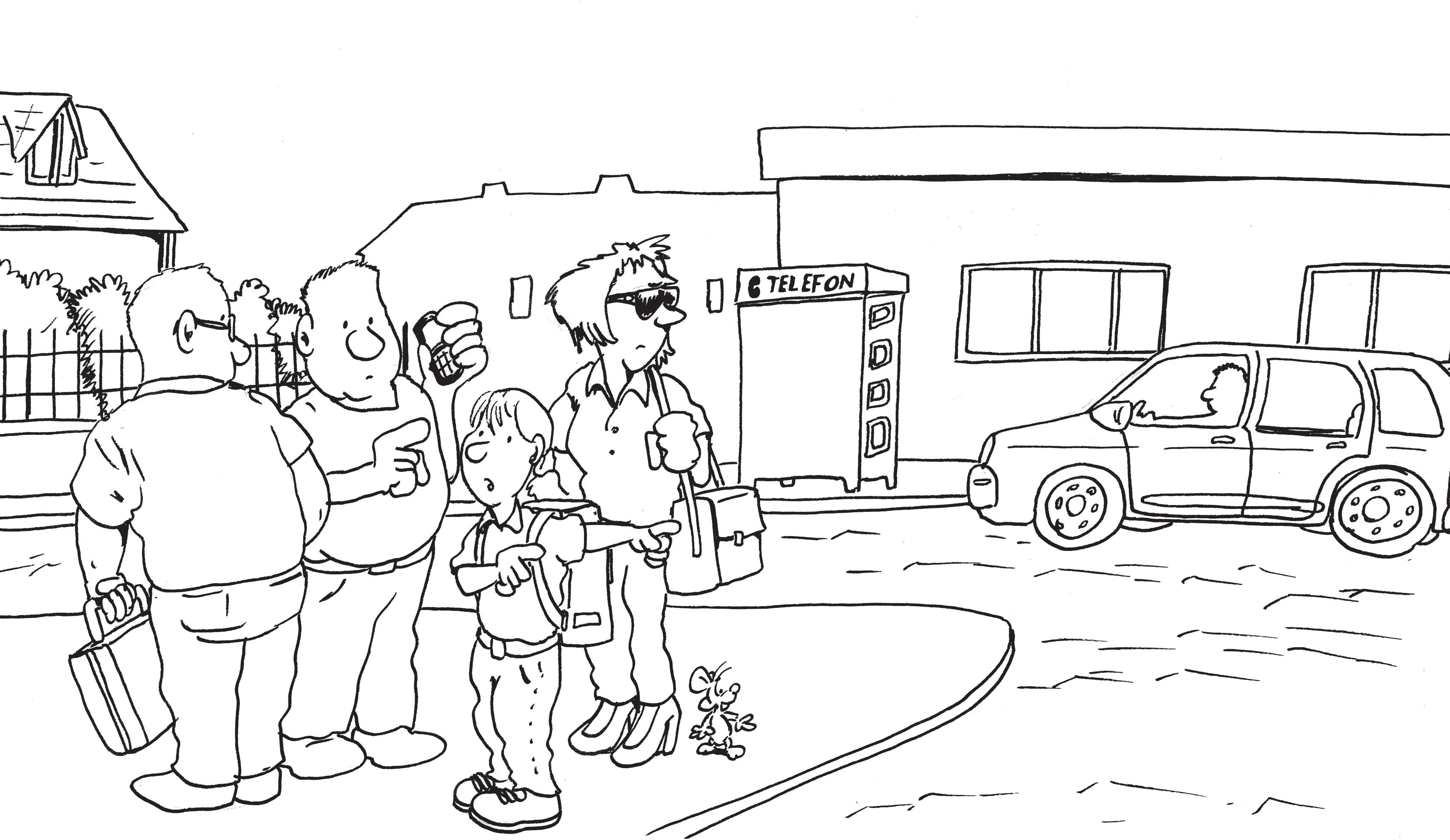 Thomas geht nach der Schule vom Gymnasium direkt zur nahen Bushaltestelle, wo er einige Klassenkameraden trifft. Alle warten auf den Bus und als sich dieser der Haltestelle nähert, wird auf entsprechenden Abstand zum Fahrbahnrand geachtet. Niemand schubst oder drängelt – denn wenn hier ein Kind aus Versehen auf die Straße und vor den Bus stürzt, kann das schnell böse enden!