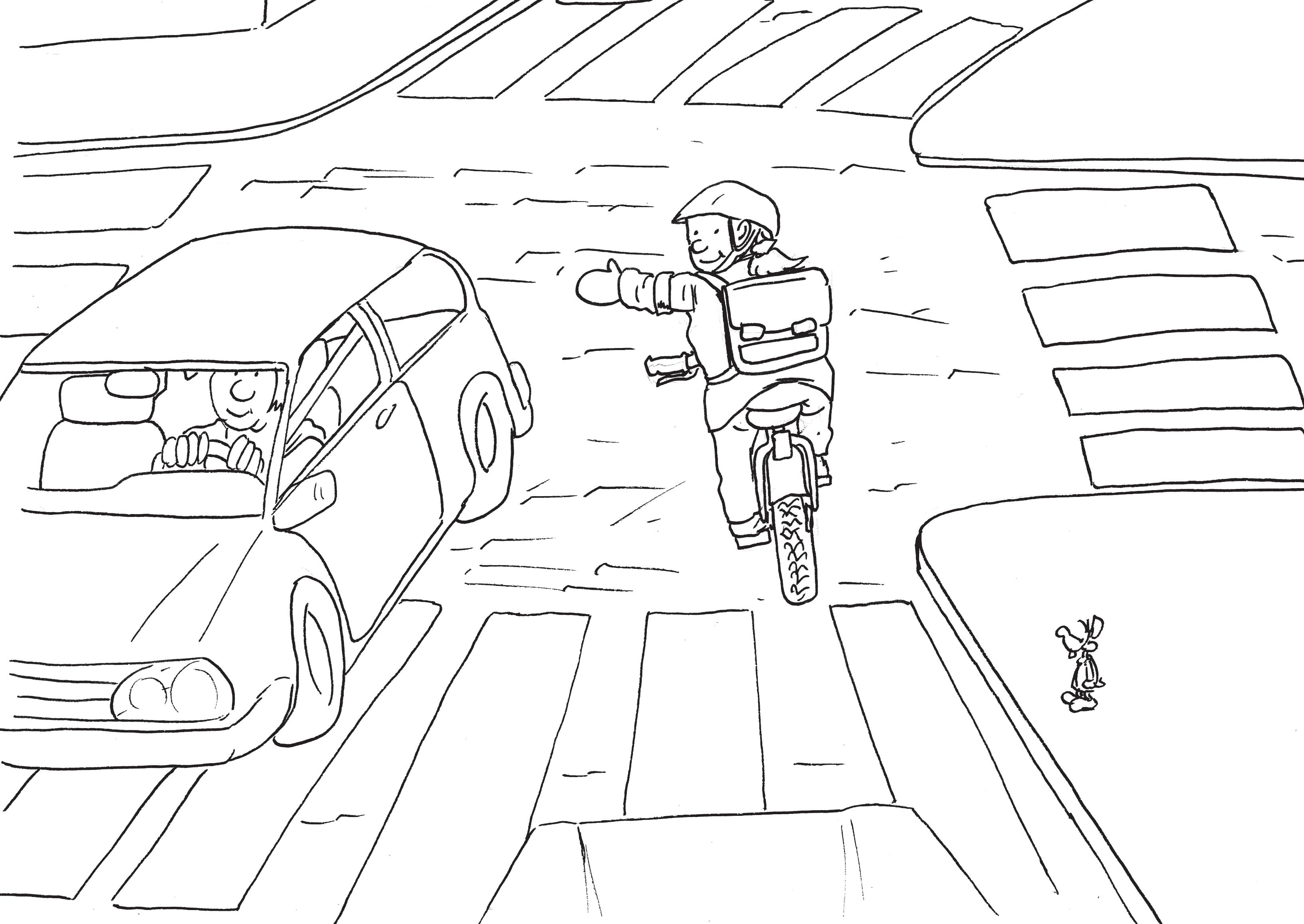Natalie freut sich, denn es ist in der Schule eine Stunde ausgefallen und sie kann früher nach Hause. Auf dem Heimweg gibt es leider keinen eigenen Radweg, weshalb sie besonders gut aufpassen muss. Beim Linksabbiegen schaut Natalie zuerst nach hinten, gibt ein deutlich sichtbares Zeichen mit der linken Hand und biegt dann ab. Besonders wichtig: auf den nahenden Gegenverkehr achten!