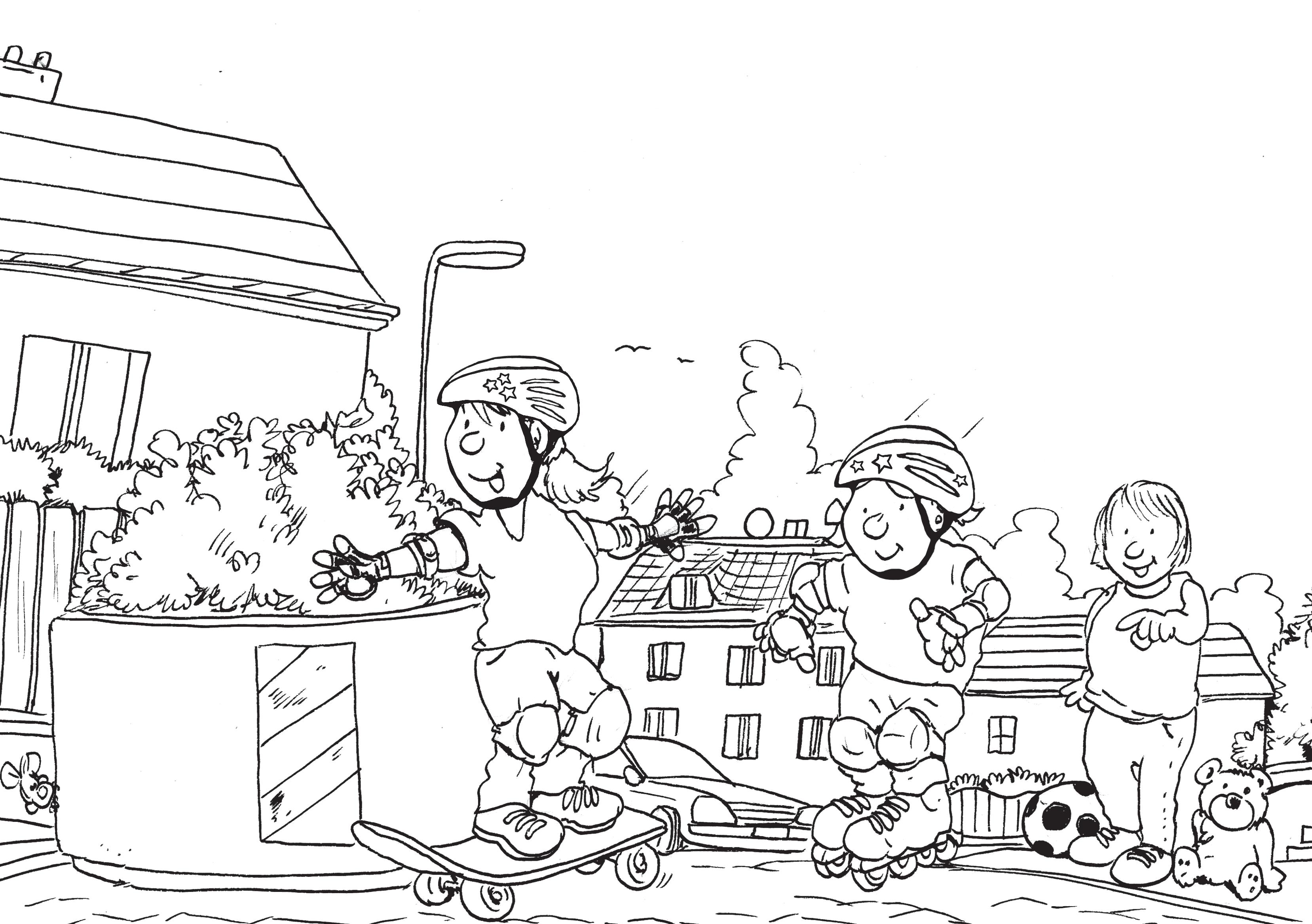 Heute sind Theresa und Natalie bei Freundinnen zu Besuch. Dort ist es besonders nett, denn sie wohnen in einer Spielstraße. Das bedeutet, dass man dort auch mit einem Skateboard oder mit Rollerskates fahren darf. Auf einer normalen Straße ist das nicht erlaubt, da es im Straßenverkehr zu gefährlich ist. Theresa und Natalie leihen sich die Skateboards ihrer Freundinnen aus, da sie es unbedingt auch einmal probieren wollen, damit zu fahren. Vorher aber schützen sie sich mit einem Helm und legen gepolsterte Protektoren für Handgelenke, Ellenbogen und Knie an. Man weiß ja nie …