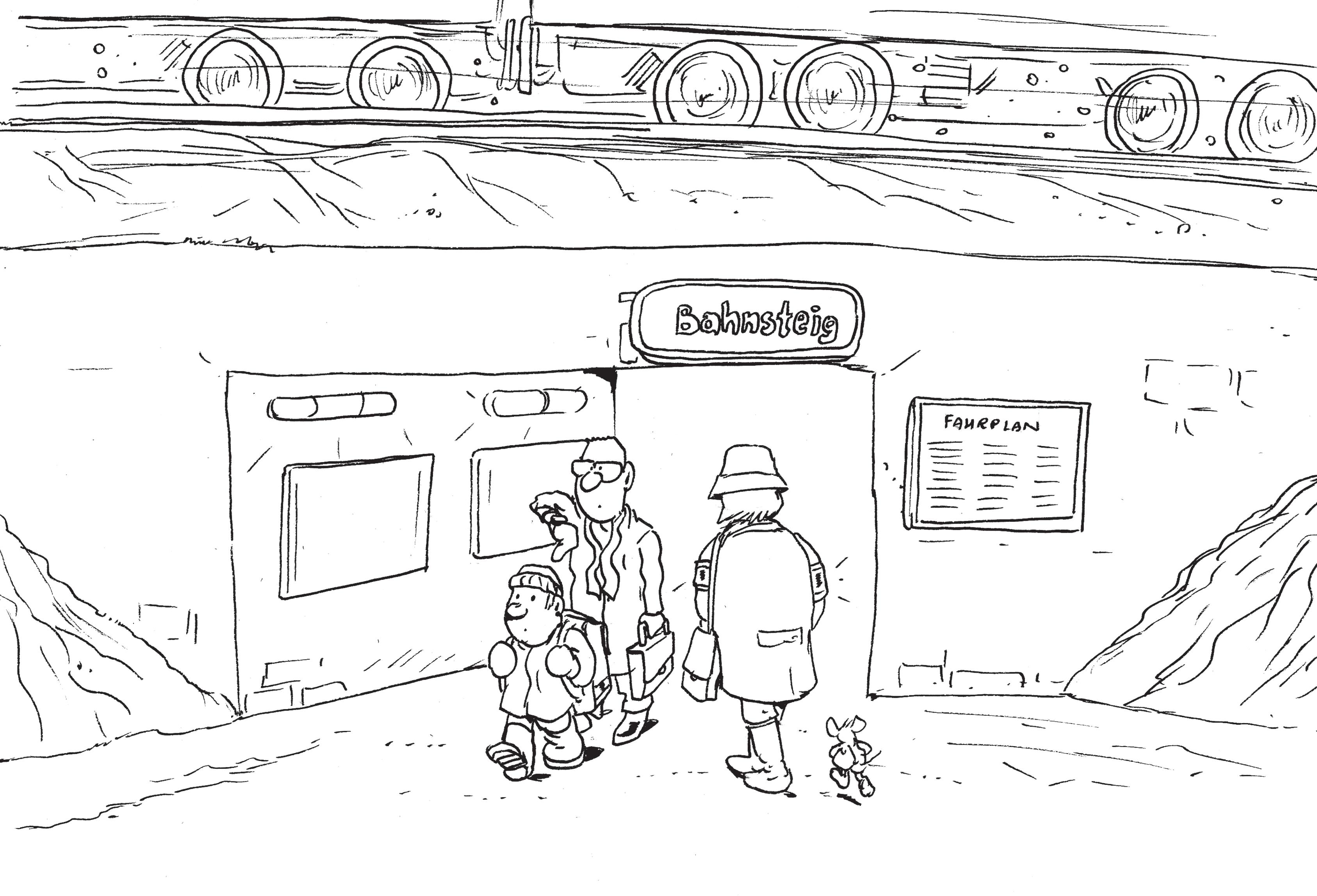Damit sie den Zug auf keinen Fall versäumt, achtet Mama Heidi darauf, immer rechtzeitig das Haus zu verlassen. Als sie am Bahnhof ankommt, betritt sie die Unterführung, um zum richtigen Bahnsteig zu gelangen. Das Betreten der Gleise ist gefährlich und strengstens untersagt.