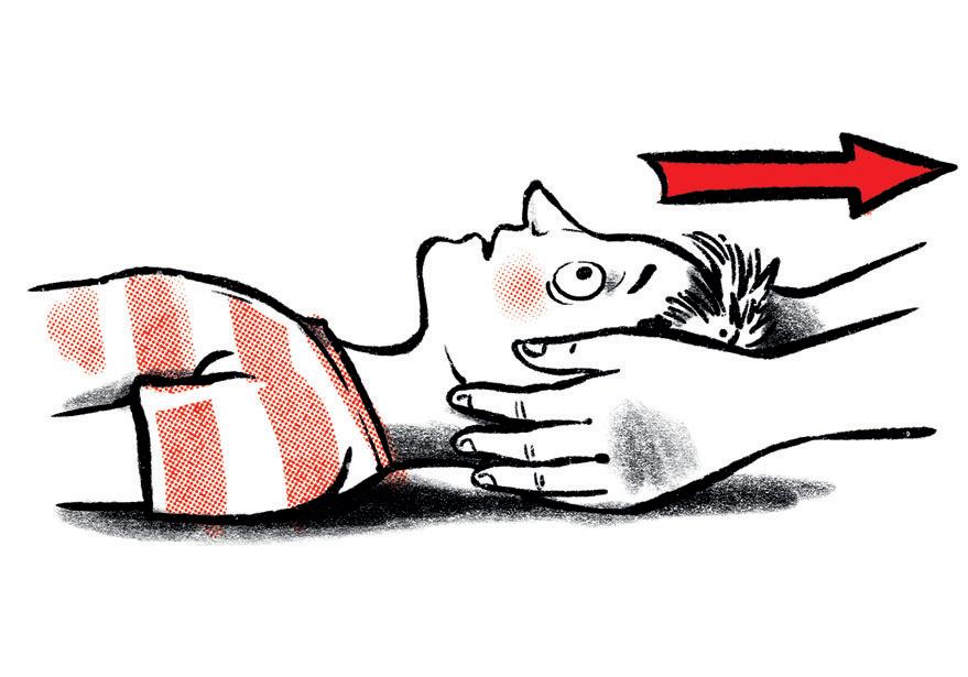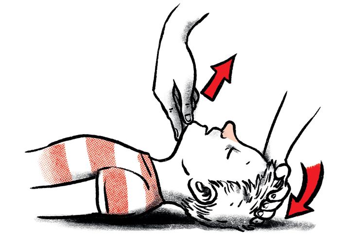 • pomalým tahem za bradu a tlakem na elo zakláníme hlavu