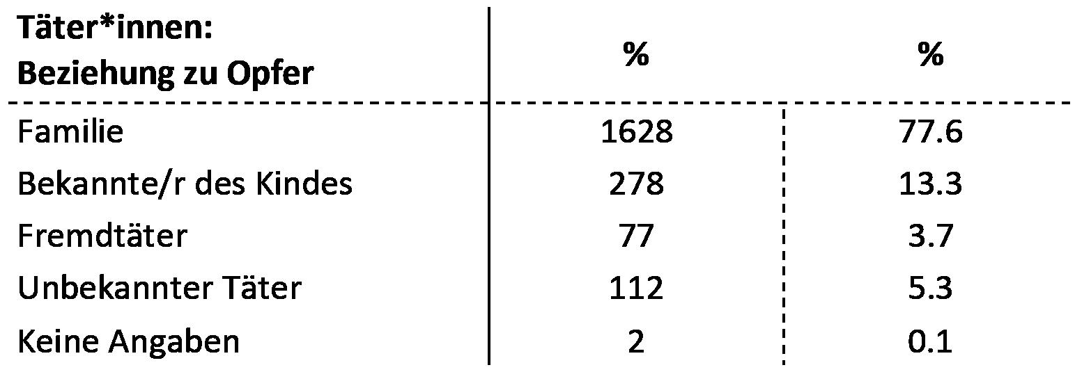 In den meisten Fällen steht bei kleinen Kindern eine Gefährdung durch die direkten Bezugspersonen im Vordergrund. Je nach Betreuungssituation des Kindes betrifft dies aber nicht nur die Eltern sondern auch Fachpersonen der familienergänzenden Betreuung, Heimpersonal, Geschwister und andere Personen, mit denen das Kind im direkten Kontakt steht. Eher selten geht die Gefährdung kleiner Kinder von einer völlig fremden Person aus.