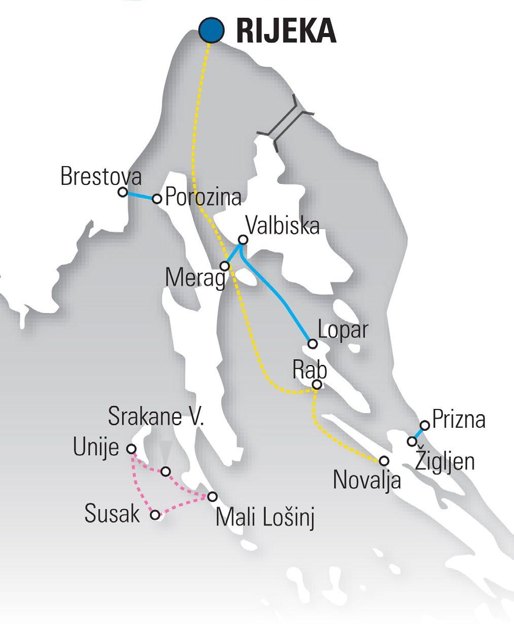 The island of Rab is located in the middle of the Kvarner Bay, accompanied by dozens of other islands. Like the croatian coast itself, this 22 km long and 11 km wide island stretches northwest–southeast and is separated from the mainland by the Velebit channel.