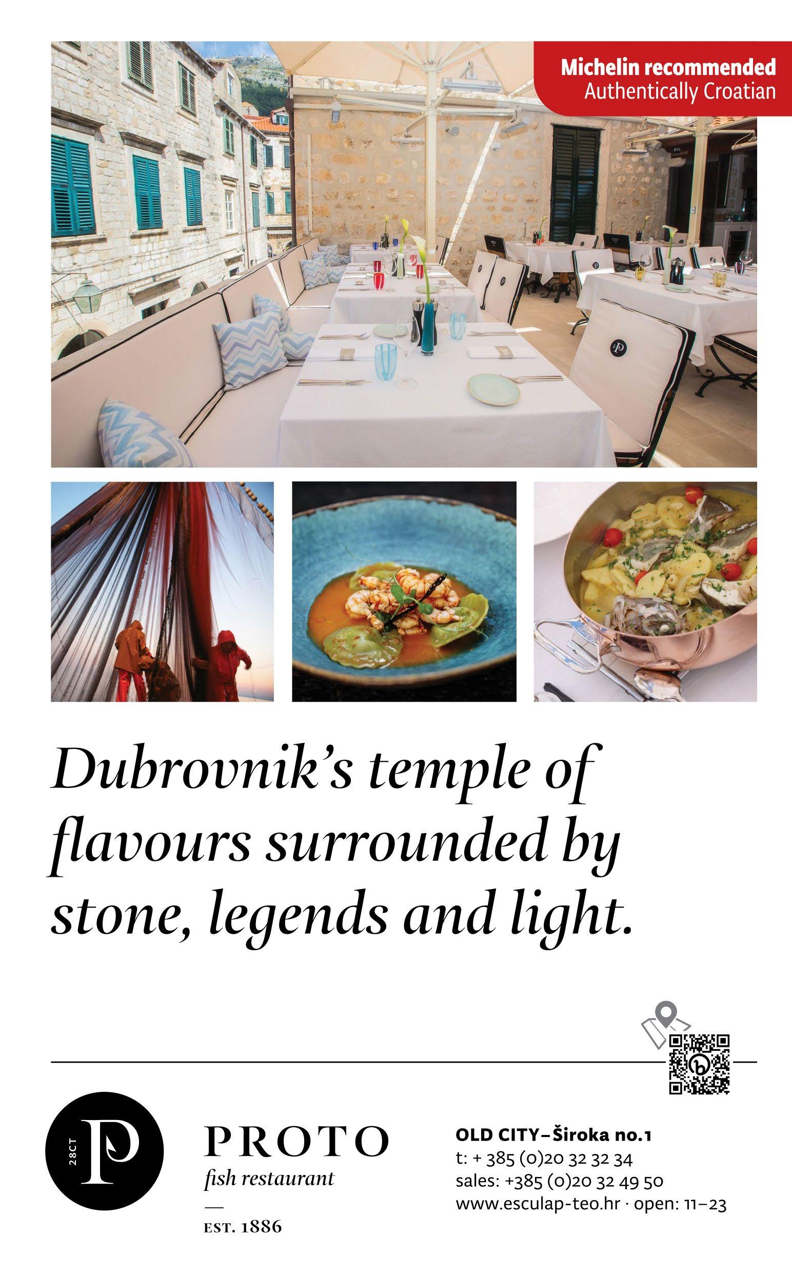 Let us now say a few words about the Dubrovnik gastronomy. There aren’t many people who haven’t heard about Proto fish restaurant, located in the historical heart of the Old City, and recommended by the Michelin Guide. If you are looking for a perfect seafood menu, then this is the place. The restaurant’s offer was inspired by original meals of aristocratic and working-class Dubrovnik families with an added touch of class of contemporary culinary trends. Guest House Forty-Four and fine dining romantic Restaurant, both located only a few steps away from the main street Stradun, welcome the lovers of luxury and friendly local atmosphere. Guests may enjoy beautifully furnished rooms as well as a magnificent garden, where on-site dining is an option upon request. Bistro Revelin, a relaxed gourmet heaven at the Ploče gate, will welcome you with creative and daring menu that bravely fuses local with globally acknowledged culinary ingredients. A carefully prepared variety of dishes is distinguished by the recipe concept as well as the presentation. Apart from the great food and an extensive wine list, the bistro has a breathtaking historical location which creates a unique romantic atmosphere.