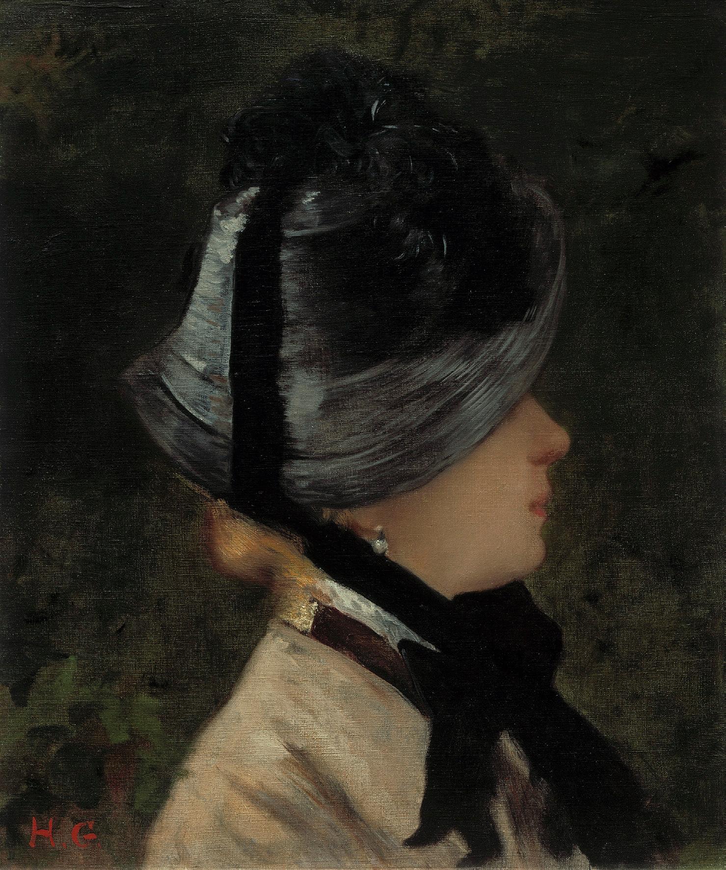 Portret van een jonge vrouw met zwarte hoed en parel oorring