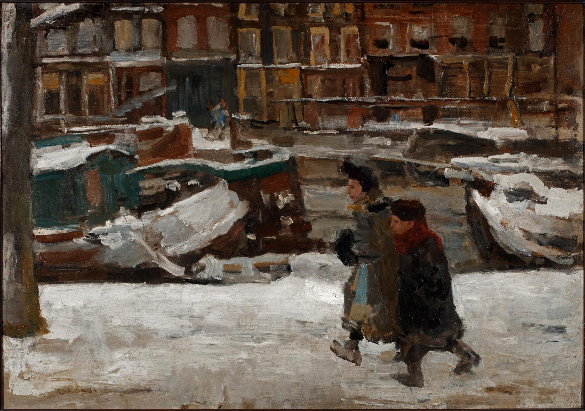 Kinderen op een besneeuwde gracht