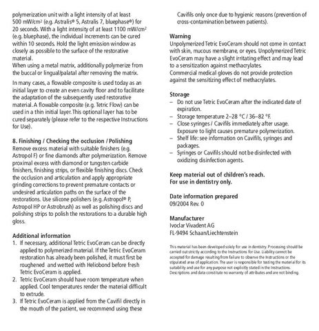 Cavifils only once due to hygienic reasons (prevention of cross-contamination between patients). Warning Unpolymerized Tetric EvoCeram should not come in contact with skin, mucous membrane, or eyes. Unpolymerized Tetric EvoCeram may have a slight irritating effect and may lead to a sensitization against methacrylates. Commercial medical gloves do not provide protection against the sensitizing effect of methacrylates. Storage – Do not use Tetric EvoCeram after the indicated date of expiration. – Storage temperature 2–28 °C / 36–82 °F. – Close syringes / Cavifils immediately after usage. Exposure to light causes premature polymerization. – Shelf life: see information on Cavifils, syringes and packages. – Syringes or Cavifils should not be disinfected with oxidizing disinfection agents. Keep material out of children’s reach. For use in dentistry only. Date information prepared 09/2004 Rev. 0 Manufacturer Ivoclar Vivadent AG FL-9494 Schaan/Liechtenstein This material has been developed solely for use in dentistry. Processing should be carried out strictly according to the Instructions for Use. Liability cannot be accepted for damage resulting from failure to observe the Instructions or the stipulated area of application. The user is responsible for testing the material for its suitability and use for any purpose not explicitly stated in the Instructions. Descriptions and data constitute no warranty of attributes and are not binding.