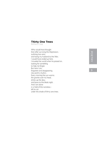Who would have thought that after surviving the Depression, outliving two sons, and losing my husband to the War, I would have ended up here. I traveled the world when he passed on, looking for something to help me forget. But here I am, forgotten and disappearing into ear th’s rhythm. Every morning the sun warms the granite over my head, drinks up the dew, and bows to the bleak night. And I am alone in a field of the nameless-left to rot under the shade of thir ty one trees.