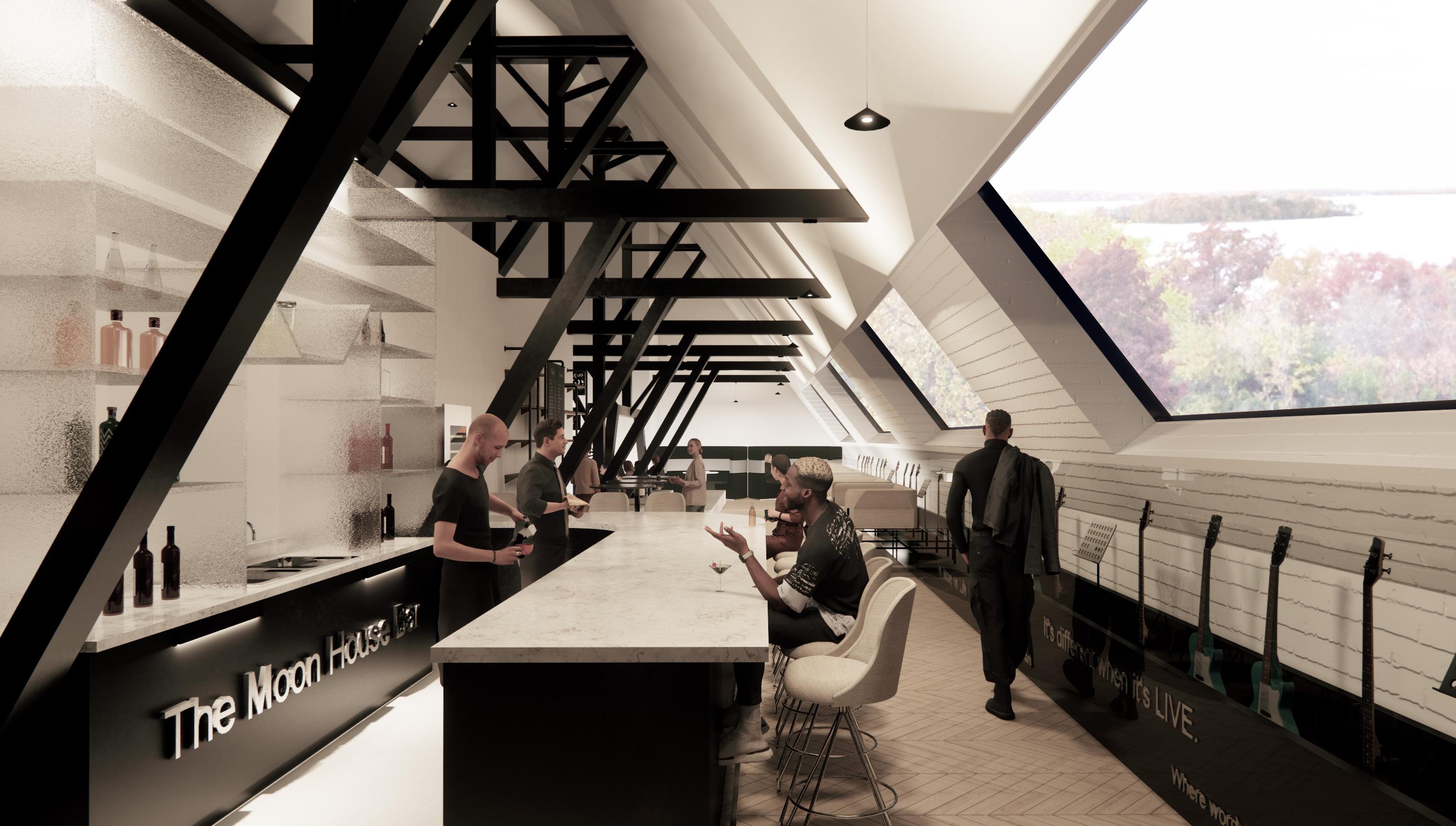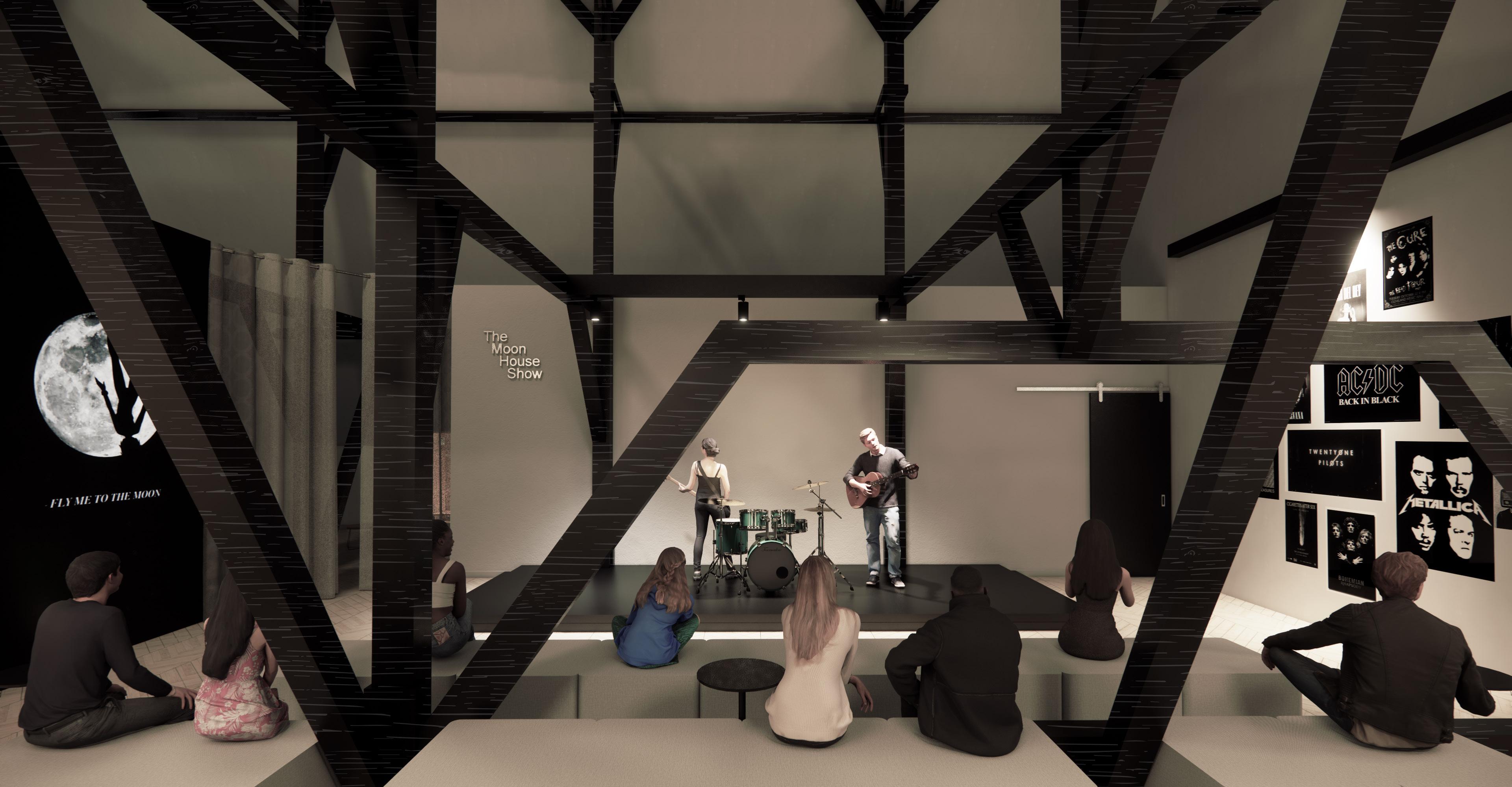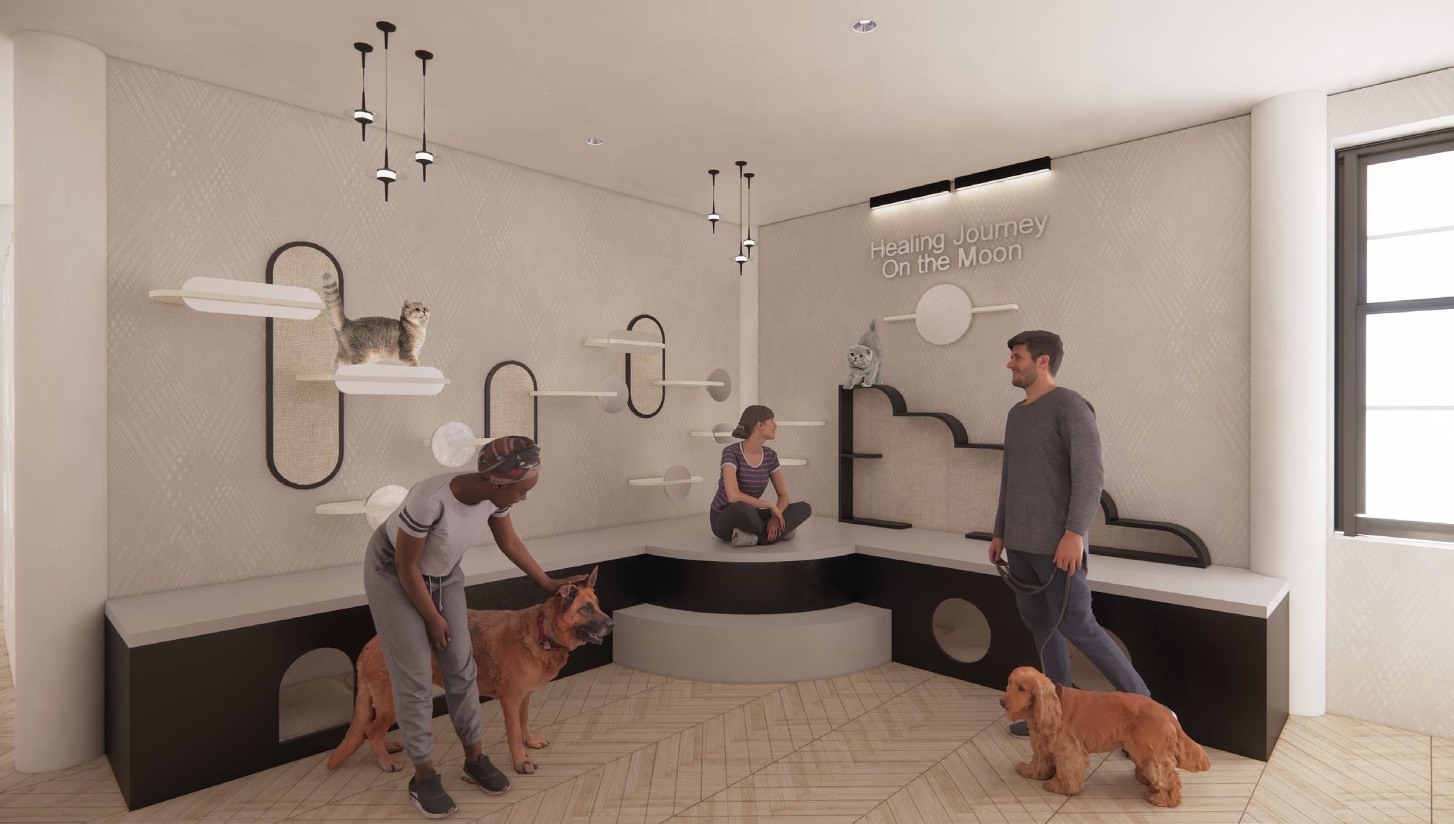 The Moon House boosts a wellness cafe, evening bar, and a special performance area for student activities such as music and comedy. The pet therapy rooms, the wellness cafe, stduent work retail space, and the historical gallery are located on the first two floors, create a intimate, calming and healing atmosphere. As students move up to the third floor, the space becomes more dynamic, engaging, and mysterious. The Moon House bar and the Moon House show encourage students to develop creativity, socialization and contribution to a larger community.
