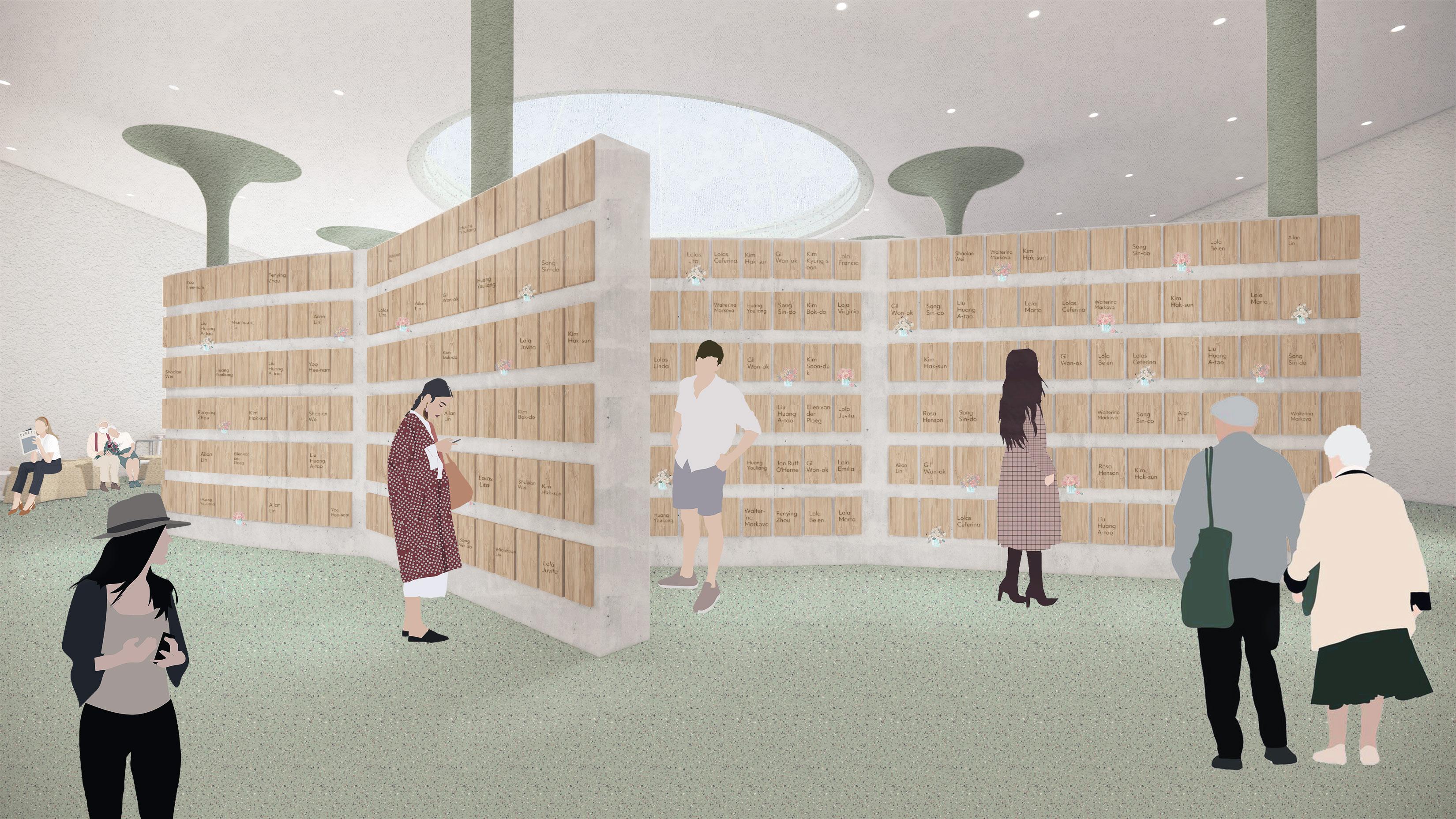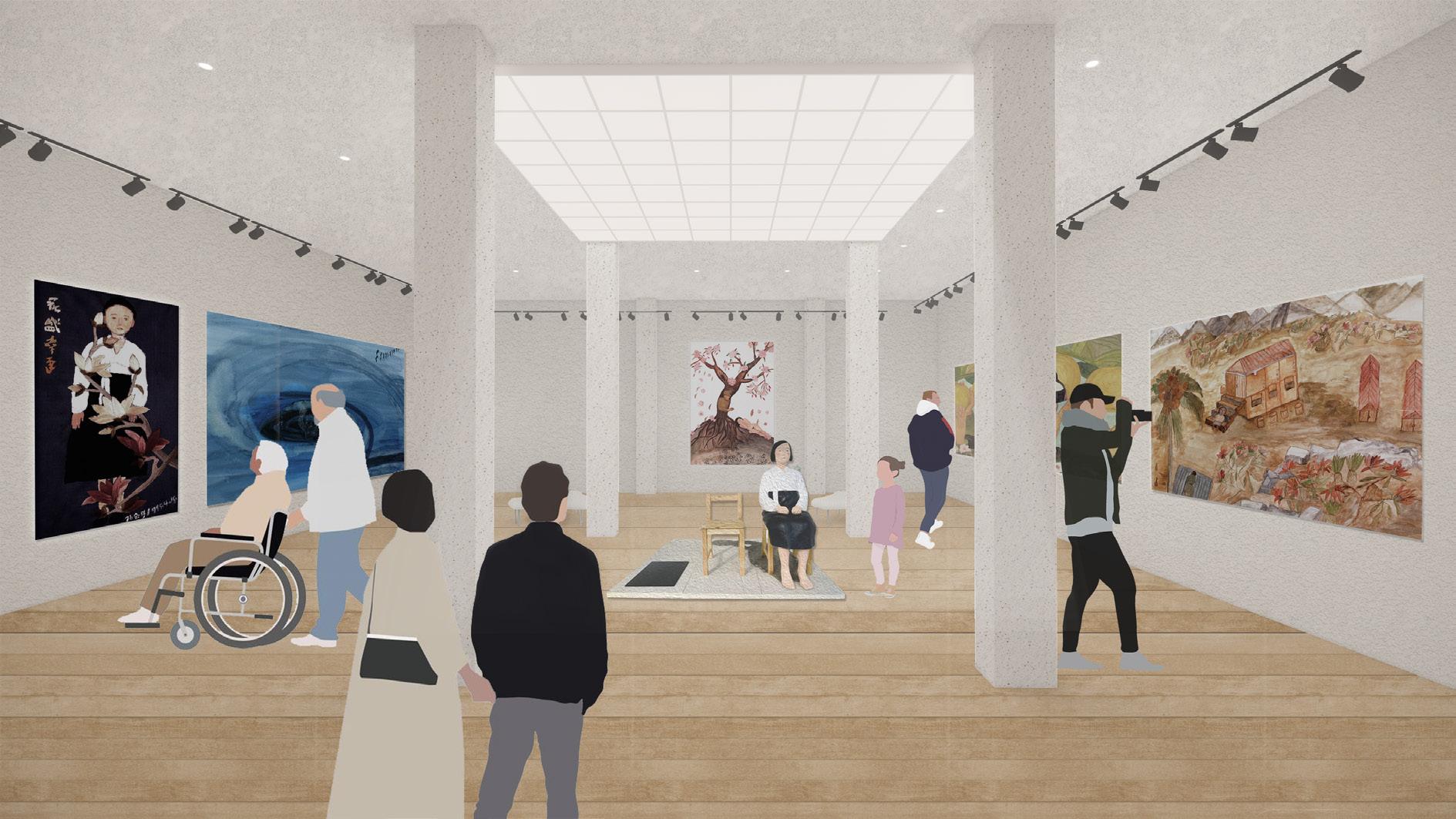 The visiting experience transits from the main exhibition presenting dark and painful history, objects and paintings, to a brighter women’s art exhibition, and finally a contemporary exhibition space. The interactive memorial wall and courtyard is located at the center, providing a space for visitors to rest and contemplate. By accomplishing the tour, the visitors experience pain, sorrow, forgiveness, reconcilation, hope, and finally being cured.