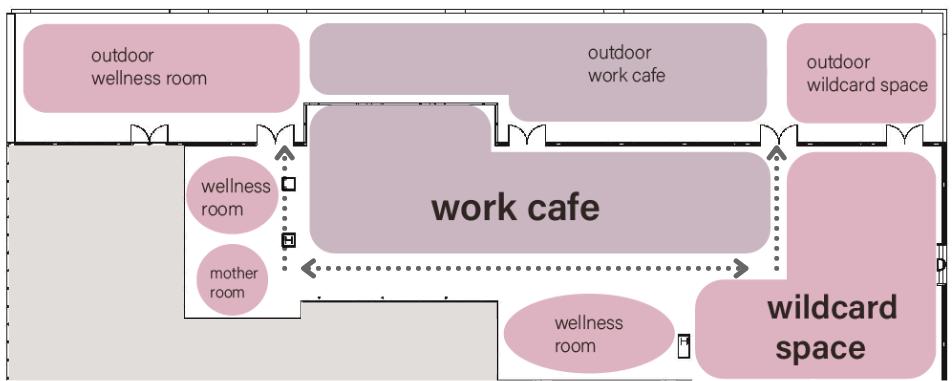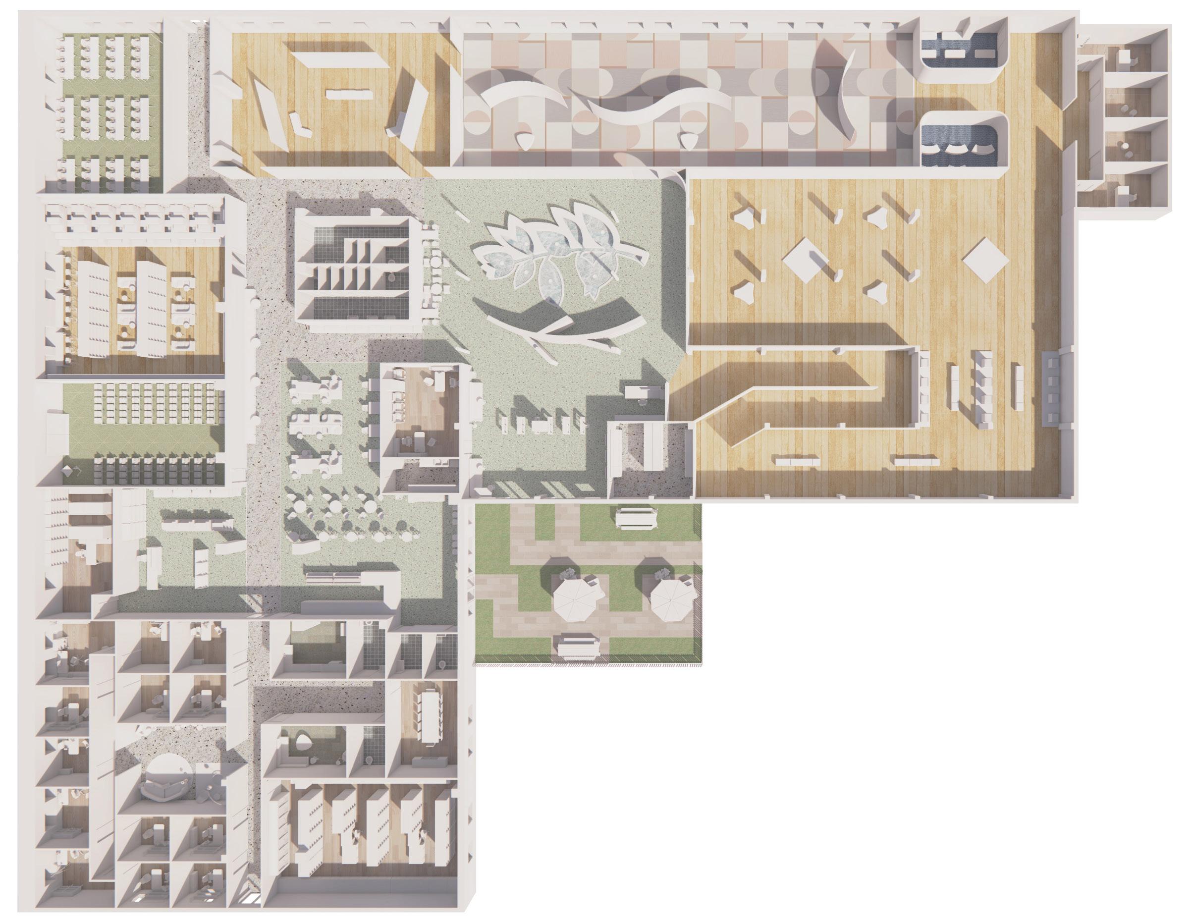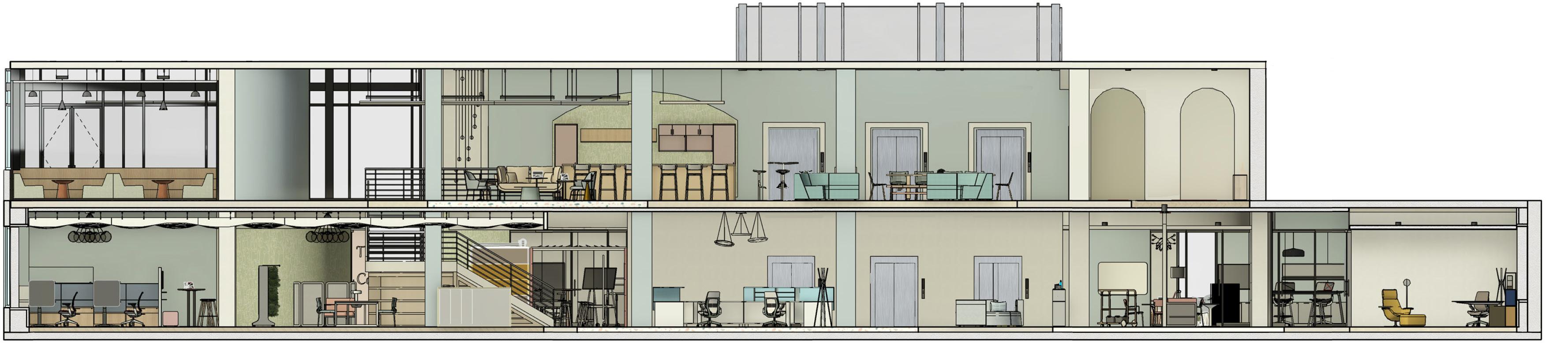 To create a fully immersive and inspiring environment, multiple senses like olfactory, tactile, and visual stimulations are spread through the space. Considering the post-pandemic influences, personal spaces, community spaces, and vitural working spaces are carefully arranged with the aid of technology.