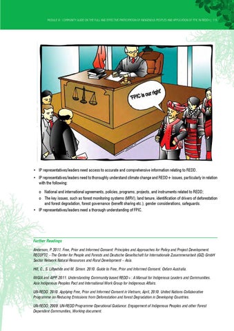 Further Readings Anderson, P. 2011. Free, Prior and Informed Consent: Principles and Approaches for Policy and Project Development. RECOFTC – The Center for People and Forests and Deutsche Gesellschaft fur Internationale Zusammenarbeit (GIZ) GmbH Sector Network Natural Resources and Rural Development – Asia. Hill, C., S. Lillywhite and M. Simon. 2010. Guide to Free, Prior and Informed Consent. Oxfam Australia. IWGIA and AIPP. 2011. Understanding Community based REDD+: A Manual for Indigenous Leaders and Communities. Asia Indigenous Peoples Pact and International Work Group for Indigenous Affairs. UN-REDD. 2010. Applying Free, Prior and Informed Consent in Vietnam, April, 2010. United Nations Collaborative Programme on Reducing Emissions from Deforestation and forest Degradation in Developing Countries. UN-REDD, 2009. UN-REDD Programme Operational Guidance: Engagement of Indigenous Peoples and other Forest Dependent Communities, Working document.