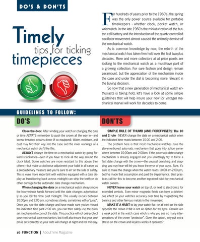 or hundreds of years prior to the 1960’s, the spring was the only power source available for portable timekeepers - whether clock, pocket watch, or wristwatch. In the late 1960’s the miniaturization of the button cell battery and the introduction of the quartz controlled oscillator movement almost caused the untimely demise of the mechanical watch. As is common knowledge by now, the rebirth of the mechanical watch has taken firm hold over the last two-plus decades. More and more collectors at all price points are looking to the mechanical watch as a must-have part of a growing collection. For sure fashion and design remain paramount, but the appreciation of the mechanism inside the case and under the dial is becoming more relevant in the buying decision. So now that a new generation of mechanical watch enthusiasts is taking hold, let’s have a look at some simple guidelines that will help insure your new (or vintage) mechanical marvel will work for decades to come.