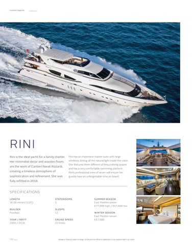 She features three different al fresco dining spaces and has a very comfortable swimming platform. Rini’s professional crew of seven will ensure her guests have an unforgettable time on board.