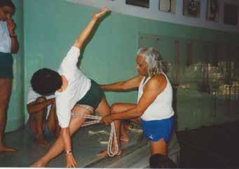 Ali: I started in 1986 and I was injured. I was doing martial arts, teaching and practising. It’s a fast sport and I had torn the ligament in my shoulder and had surgery due. My friend encouraged me to attend one of Guruji’s medical classes to get a second opinion before my operation, so I went. My arm was in a sling and I couldn’t move it. Guruji looked at me and said, “Remove this!” about my sling, “Go and hold the ropes”. So I held the ropes. “Go forward”. And he came behind me and kicked one leg and I fell forward out of the ropes. “What is this young man, you are strong but you can’t hold the rope?” I stayed for the class and at the end left thinking I would never return.