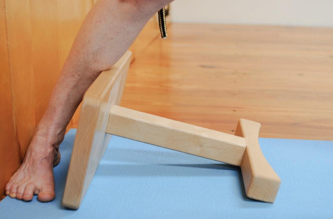 3. Position a long knee rod to the outer shin with two belts, between the gastrocnemius and anterior tibialis muscles. A “dent” will appear when you move the outer shin to the inner shin and that is the place to position the rod. The buckles are on the outer side tightened from front to back. Lift the inner foot, inner shin, and move the outer shin back. Figure 4 shows the pose independent of the wall for the purpose of depicting the prop clearly. You can use the wall for the back foot.