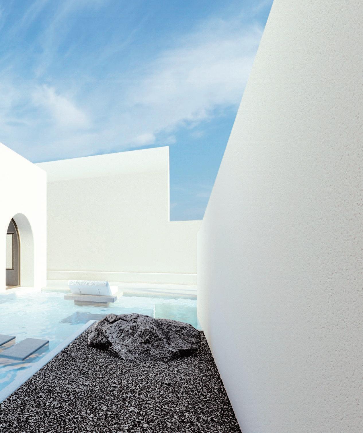 The nor th facing rocky plot is exposed to strong nor thwest winds that dominate the area Through the division of the main building volume into smaller ones, a number of outdoor spaces was created, protected from the winds, but presenting views to the sea and the Cycladic landscape