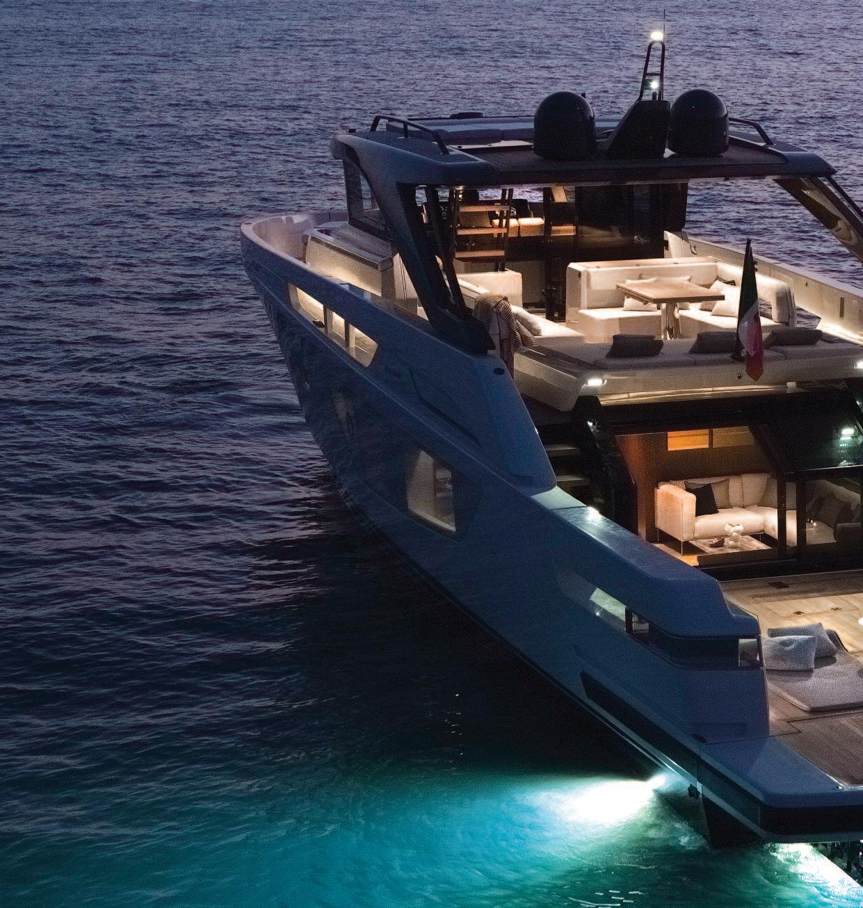 The BG72, designed by Architect Luca Santella, maintains the engineering chassis of the BGX models with the highperformance hull created in collaboration with the naval architect Lou Codega and the advanced Volvo Ips propulsion system that ensures high performance and low consumption