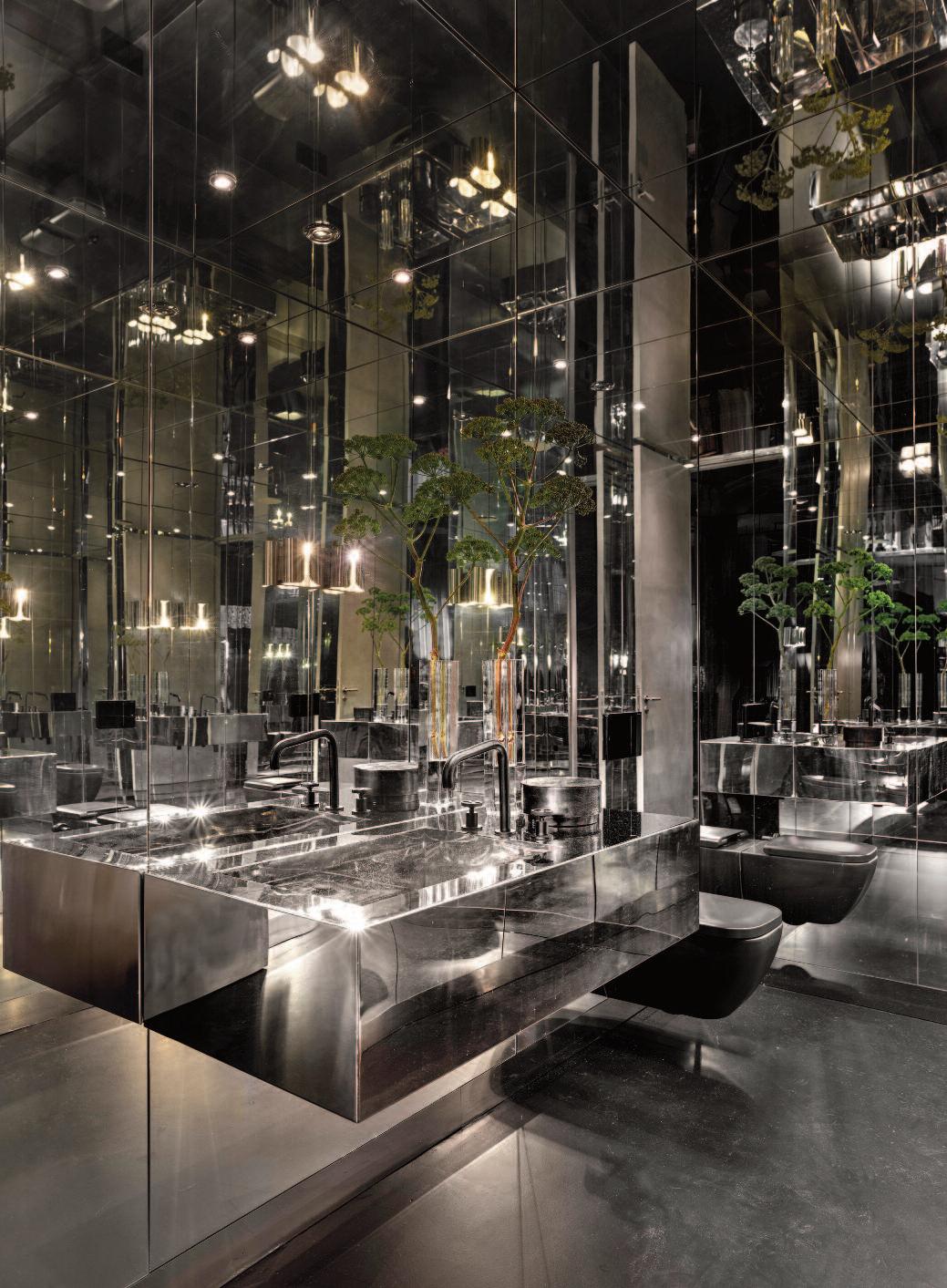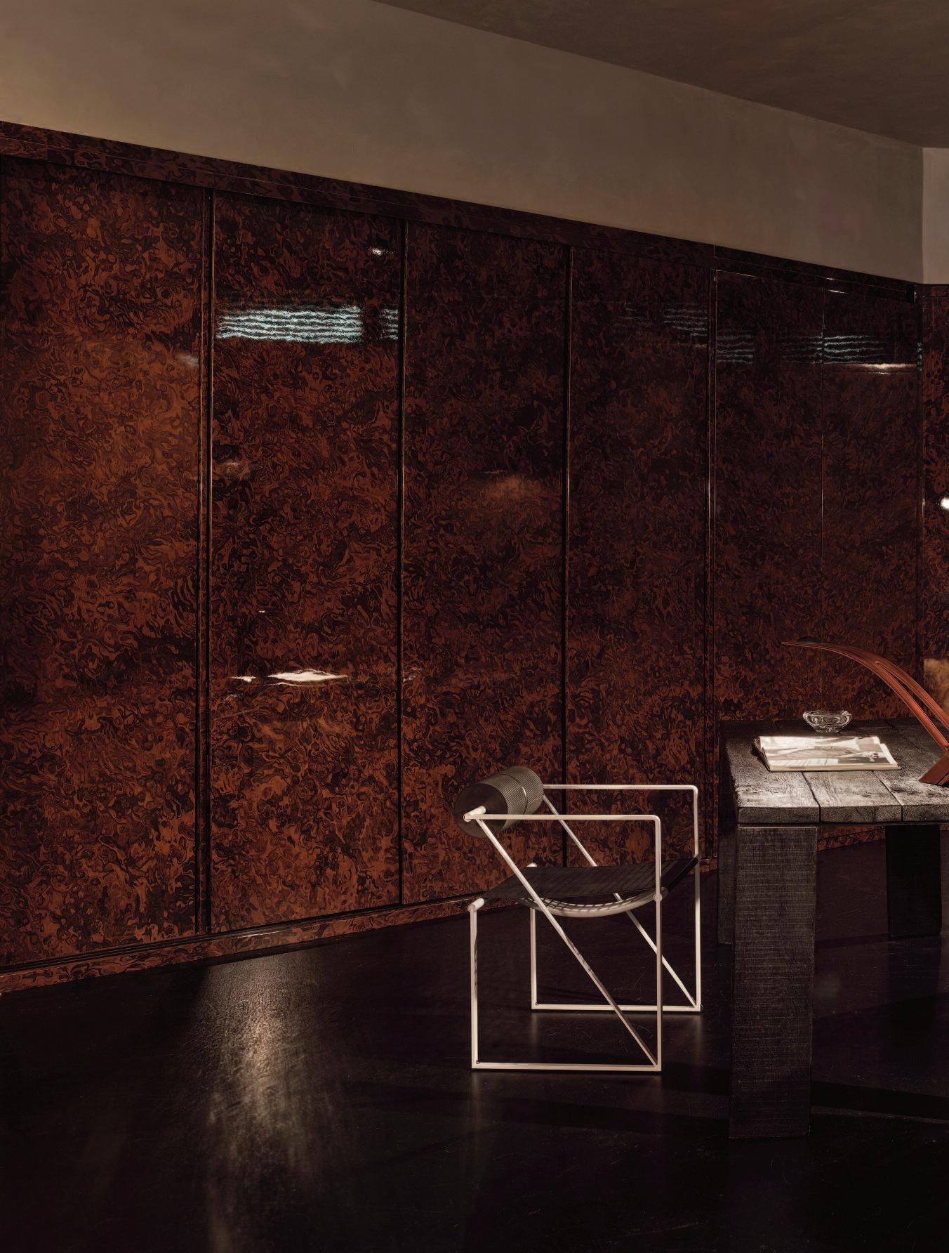 The private area includes a corridor leading to a dressing room and bathroom, with both spaces fully clad in custom carpentry finished in semi-satin dark brown lacquer The main bathroom features cabinets with mirrored fronts and a double sink in Calacatta-type Michelangelo Soft porcelain by Laminam Black taps from Cristina’s TV series, a dark steel and fluted glass divider for the shower area, and a Duravit toilet completed the space