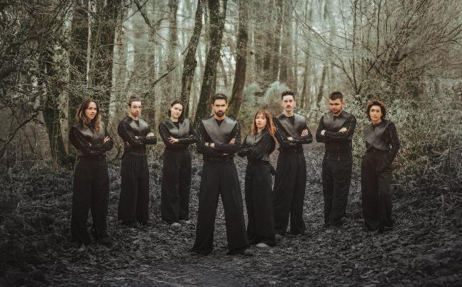 Above: the staff of 220 BPM in the dark forest surrounding the new restaurant of Lyon’s Michelinstarred chef Jeremy Galvan They are dressed in creations by Antoine Robin. Right: the chef himself.